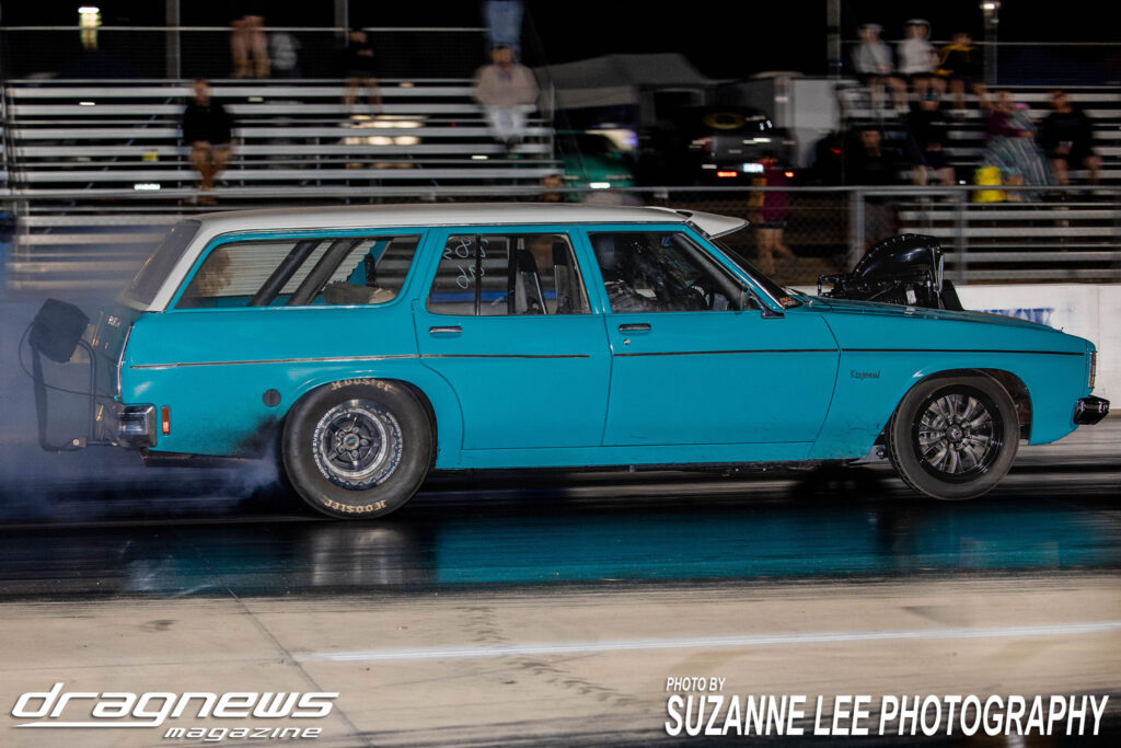 Andrew Lange’s turbo Torana moved on after taking the win over Wakeling’s blown HQ, which earned a roar from the crowd for an epic 200-foot burnout. Adam Kruger drew the bye run and cruised through to the next round.