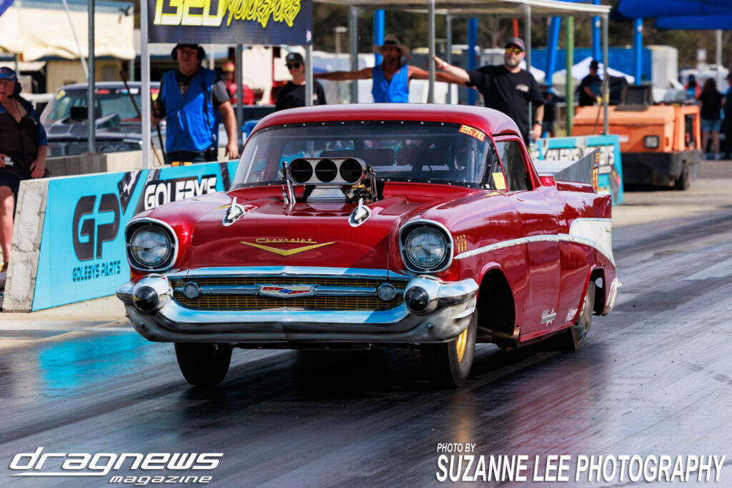 Adam Kruger’s Chev Chevelle turned in a solid 5.89 to advance after Dale Gridley battled tyre smoke down the strip. Meanwhile, Scott Cortina’s procharged HG Holden, powered by a 481X, cruised to a 4.91 on 235 radials, beating Steve Carkeet’s stunning nitrous SBC LX Torana (5.39 @ 128 MPH). Damien Boyce rounded out the round with a solo pass, laying down a tidy 4.78 @ 151 MPH.