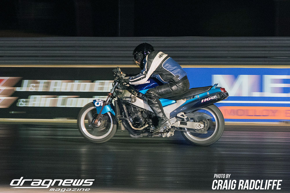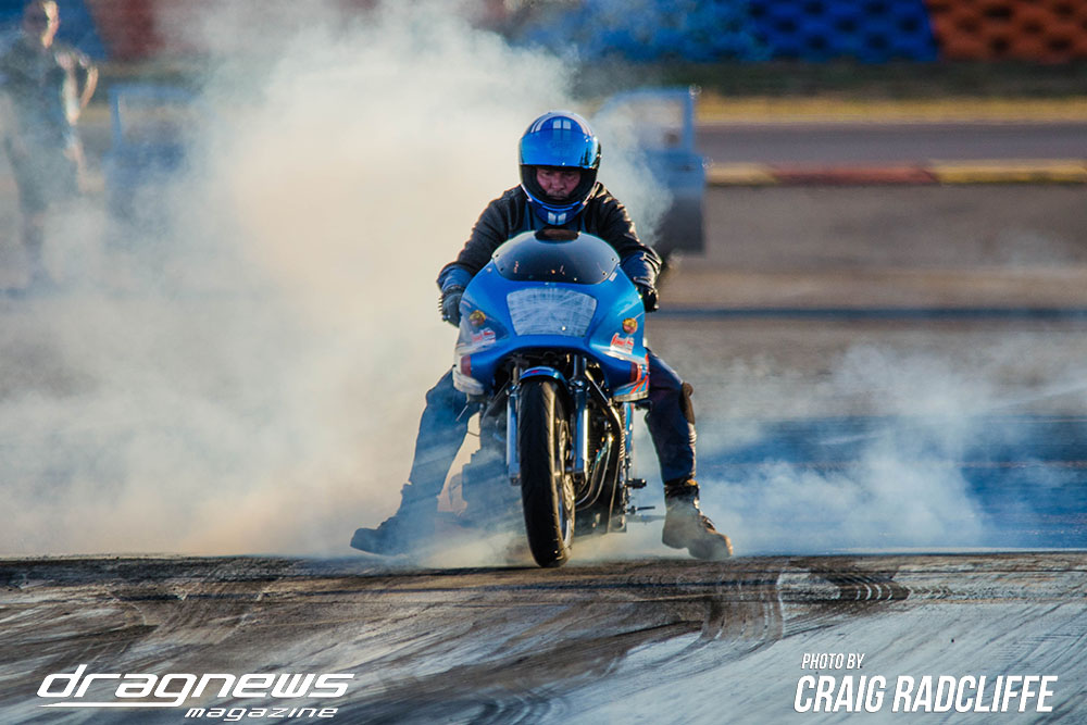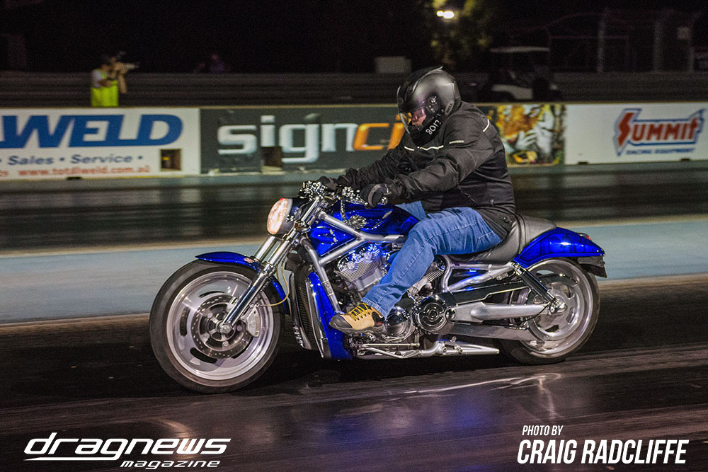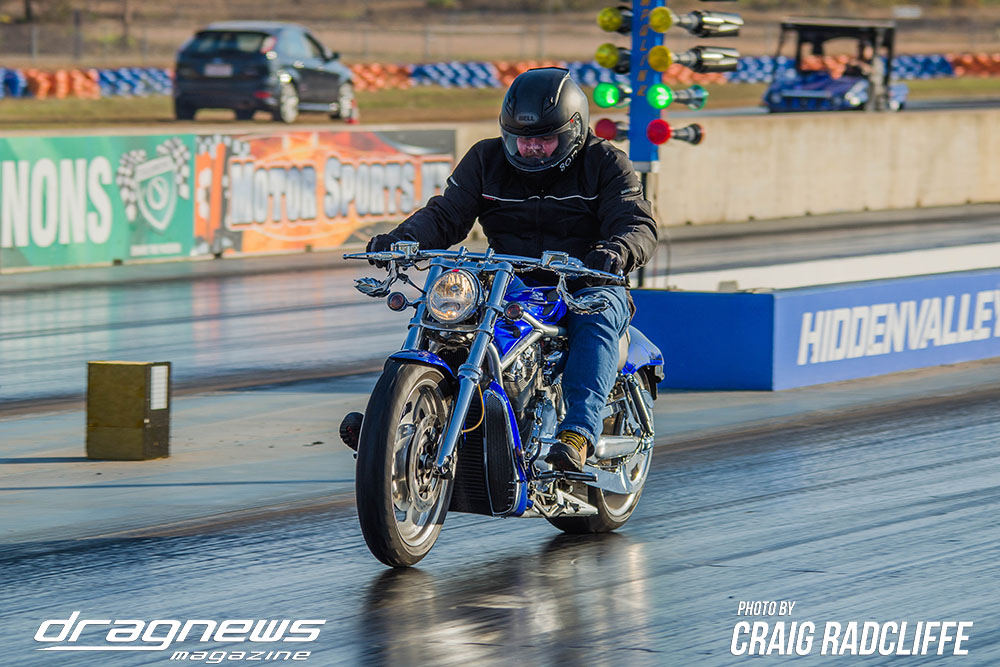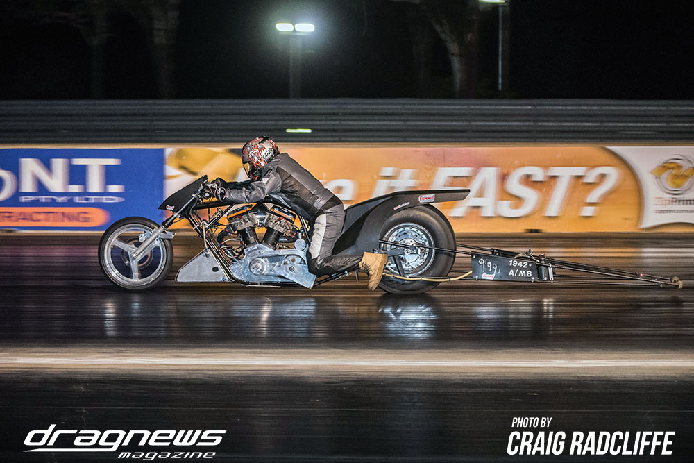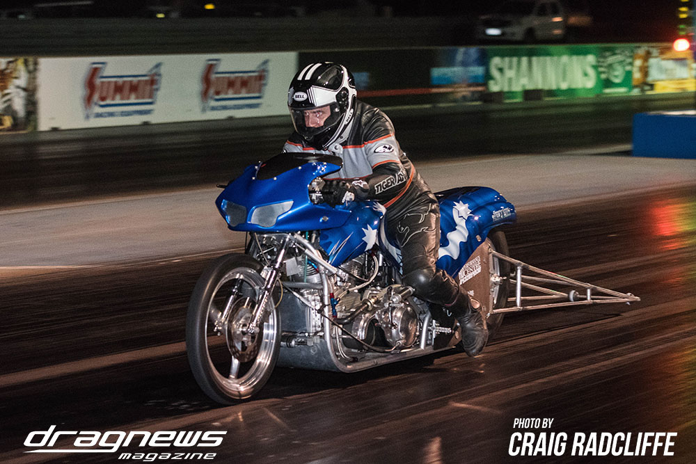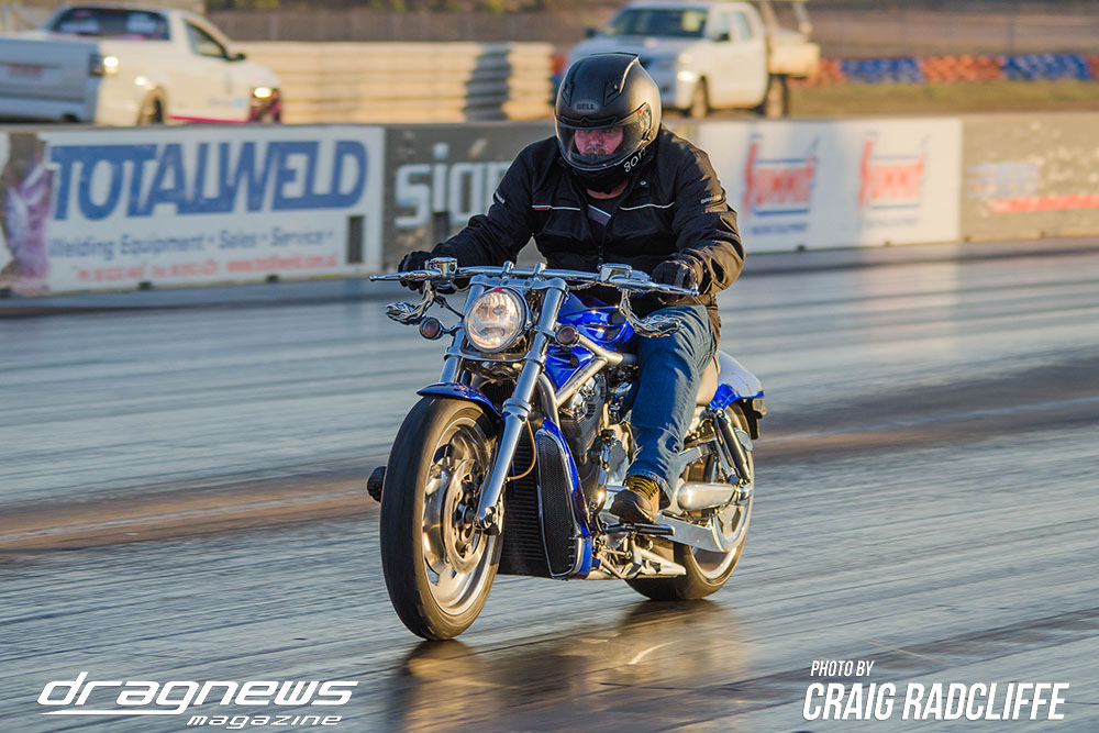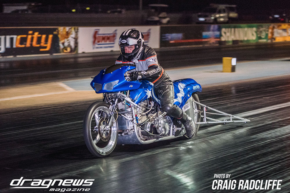 In Modified Bike Colin Sainsbury has the easiest of wins when opponent Heath Costello could not make a start on his Harley.