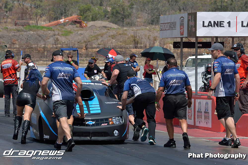 Qualifying for Pro Stock shook out like this. Aaron Tremayne headed the six car field with a 7.173 just ahead of Wayne Daley on a 7.176, next was Brian Pursell with a 7.388, John Barbagallo 7.405, Rob Nunn 7.498 and Tyronne Tremayne rounded out the field with the ex Spinozzi Camaro on a 7.732.