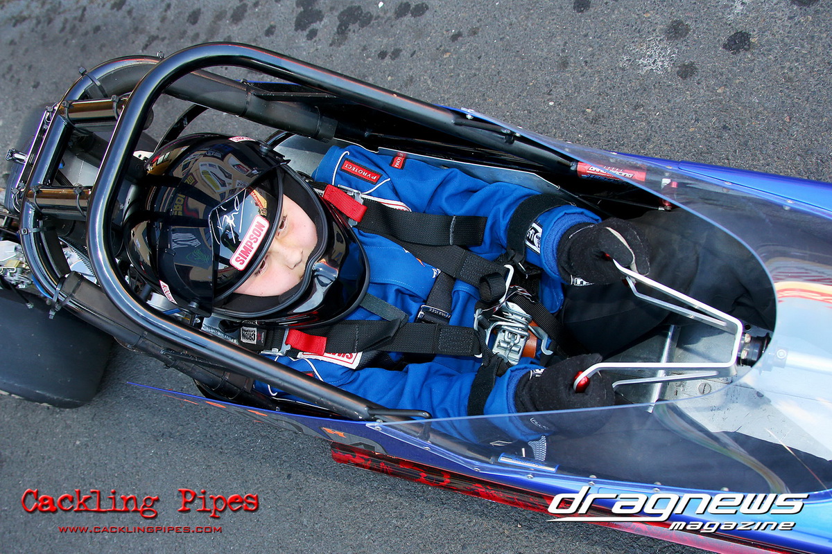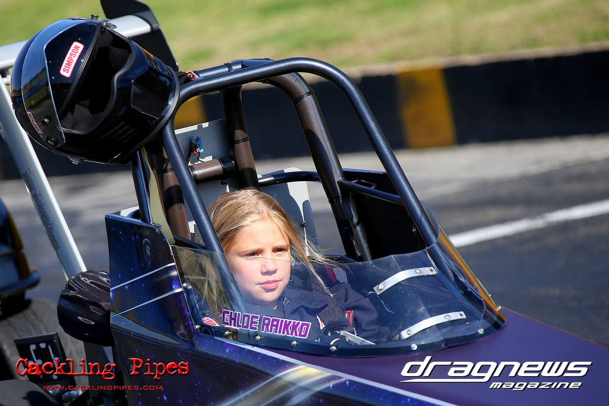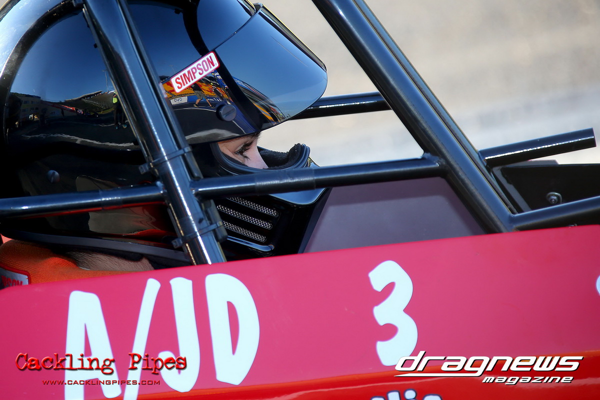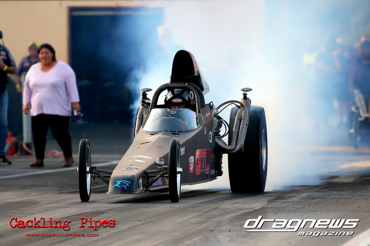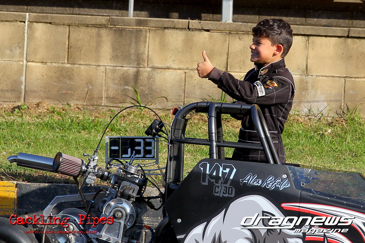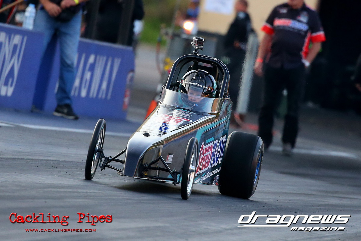 In the Junior Dragster final, both Ryan Pettiford and James Hazzard took shots at the tree in a heads up 8.02 dial in race, and both came up red. Pettiford’s -.010 was the least and the third generation racer earned his first ever win. But Hazzard still leads the championship, 20 points ahead of Nicholas Polito.
