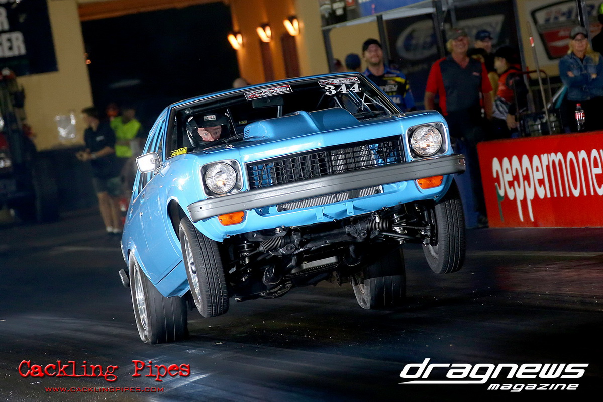 In Radial Renegade, Dale Hartill-Law strapped the radial boots onto his Mustang for the first time ever and found himself needing all his bracket racing reaction experience by winning the final over Mitchell Ford’s Torana with a 5.52 to 5.44 holeshot win. Ford though will feature in many photo highlights from the event with some monster wheelstands during the day.