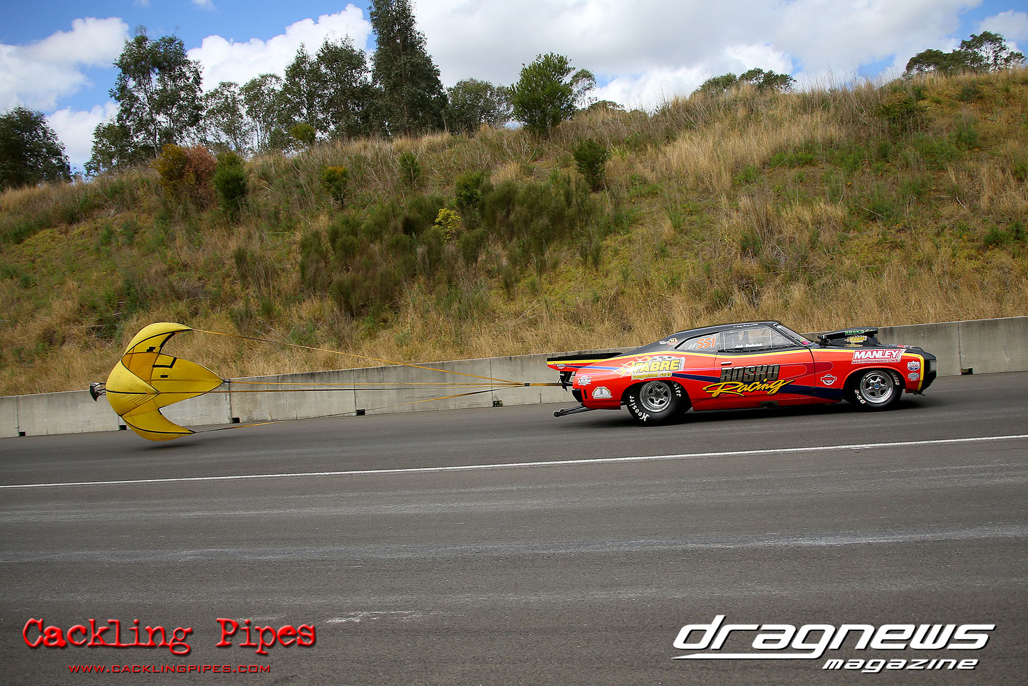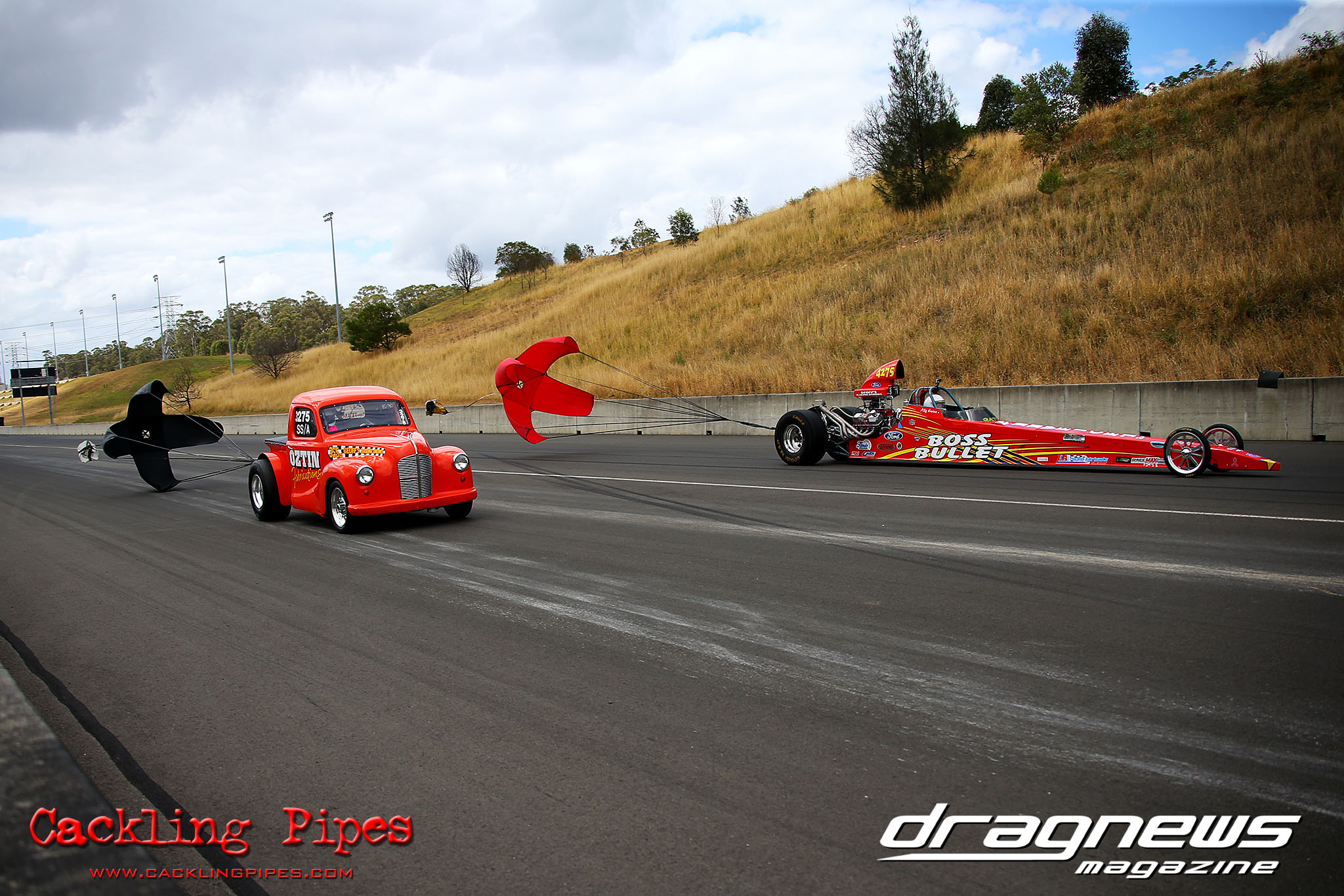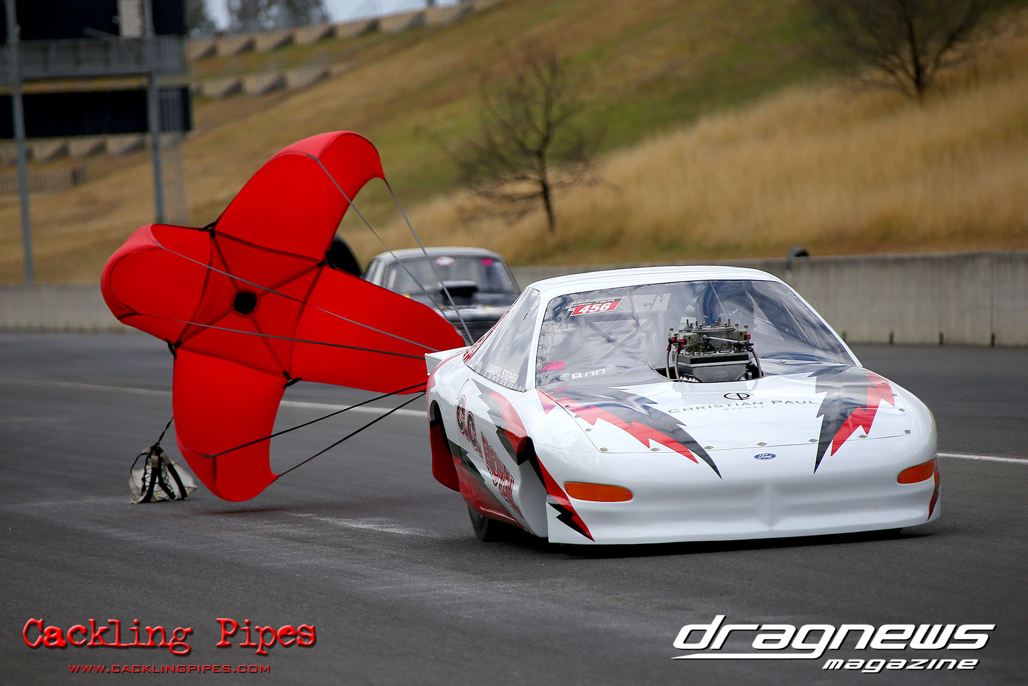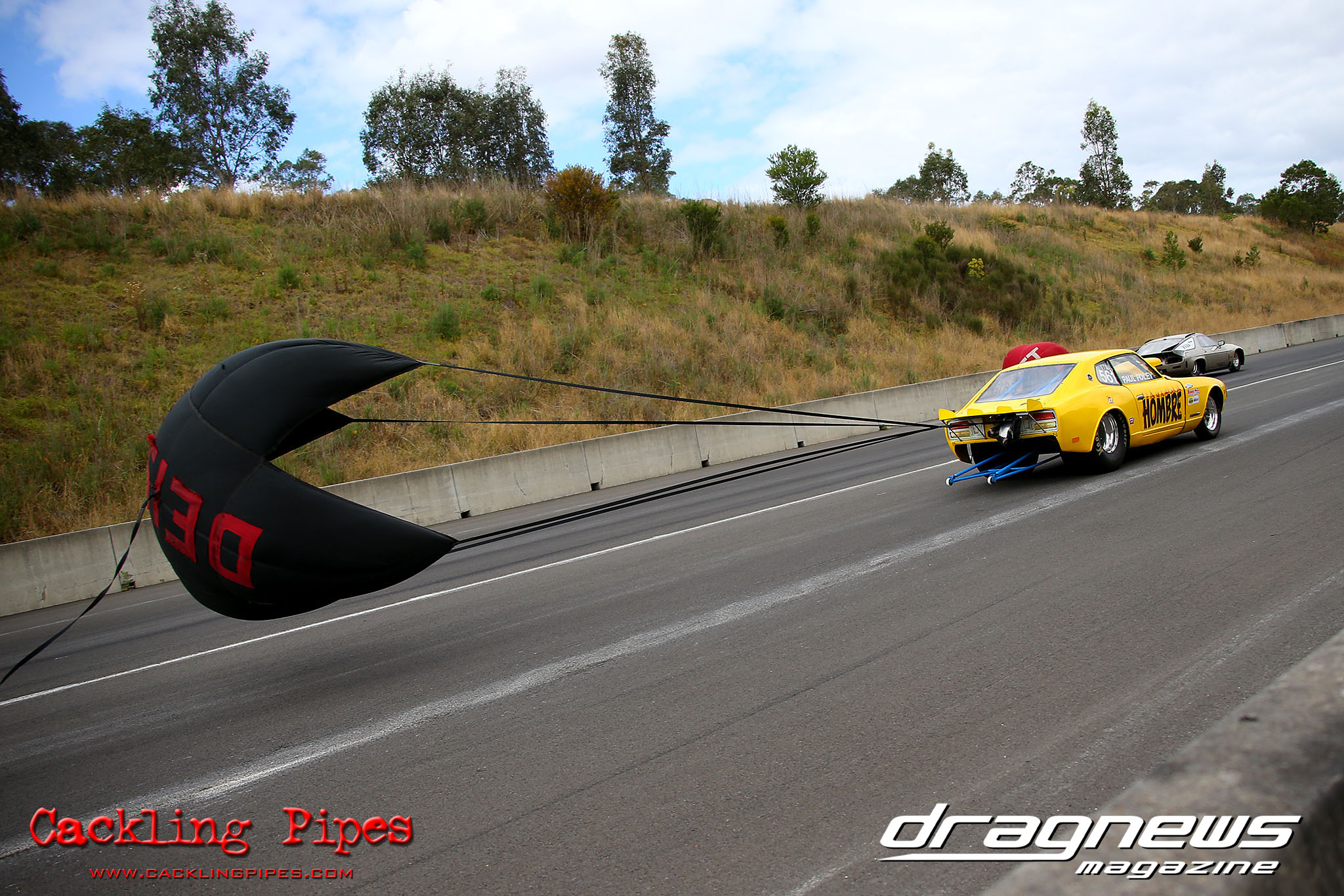 The day also featured a memorial run for the 10th anniversary for the passing of Canberra drag racing icon “Dangerous” Dougie Stewart. Doug’s twin daughters Allison and Kerrie continue the families drag racing legacy currently competing in Modified and Super Sedan respectively, and to honour their father, the OzTwins as they are known along with older sister Jacqui on the starter’s button, went side by side on a memorial run to release Doug’s ashes encased in the parachutes as they crossed the finish line.