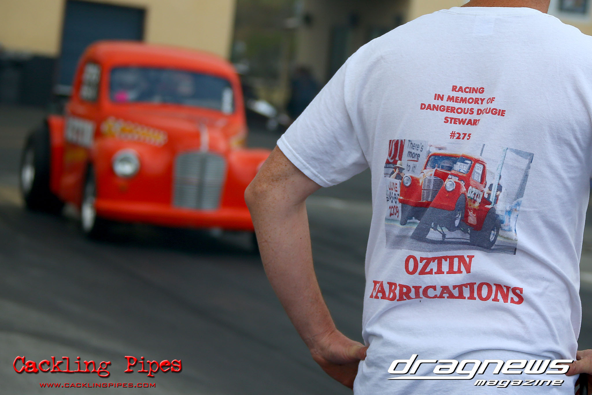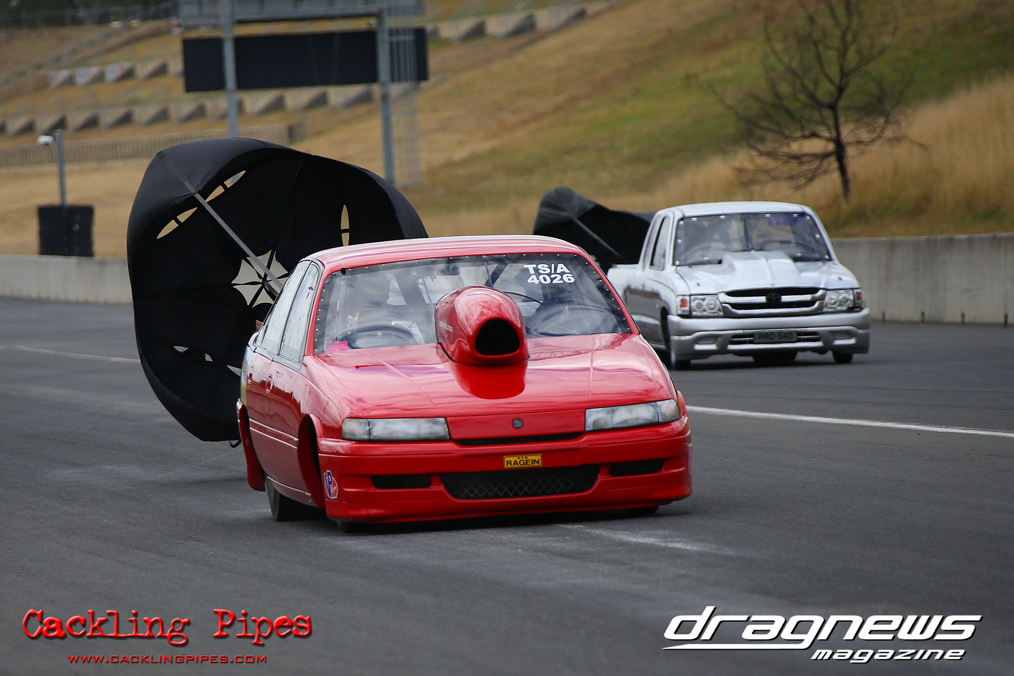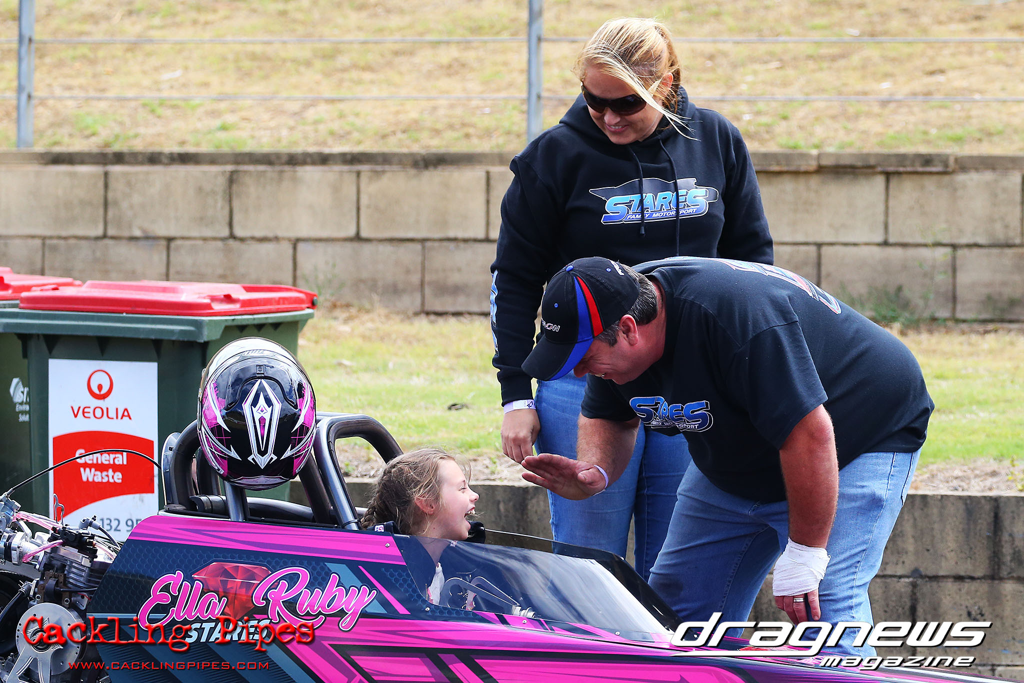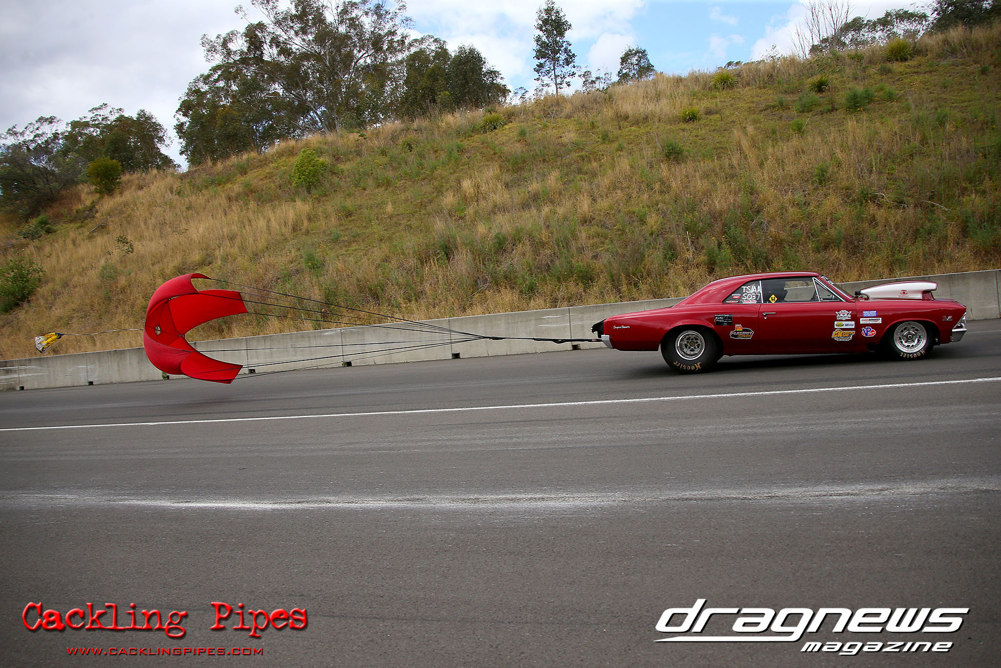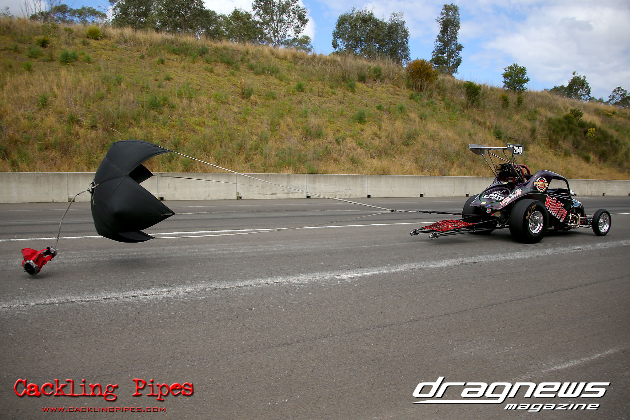 The day also featured a memorial run for the 10th anniversary for the passing of Canberra drag racing icon “Dangerous” Dougie Stewart. Doug’s twin daughters Allison and Kerrie continue the families drag racing legacy currently competing in Modified and Super Sedan respectively, and to honour their father, the OzTwins as they are known along with older sister Jacqui on the starter’s button, went side by side on a memorial run to release Doug’s ashes encased in the parachutes as they crossed the finish line.