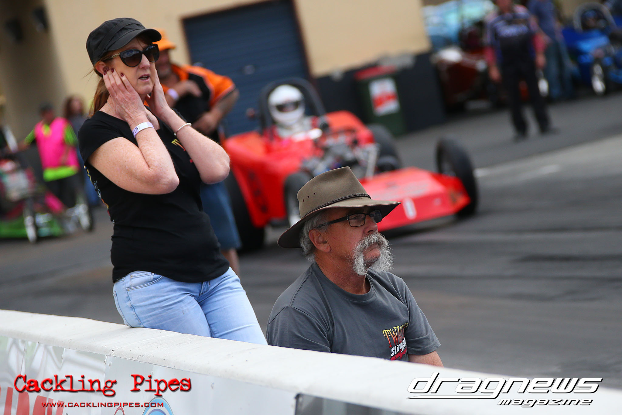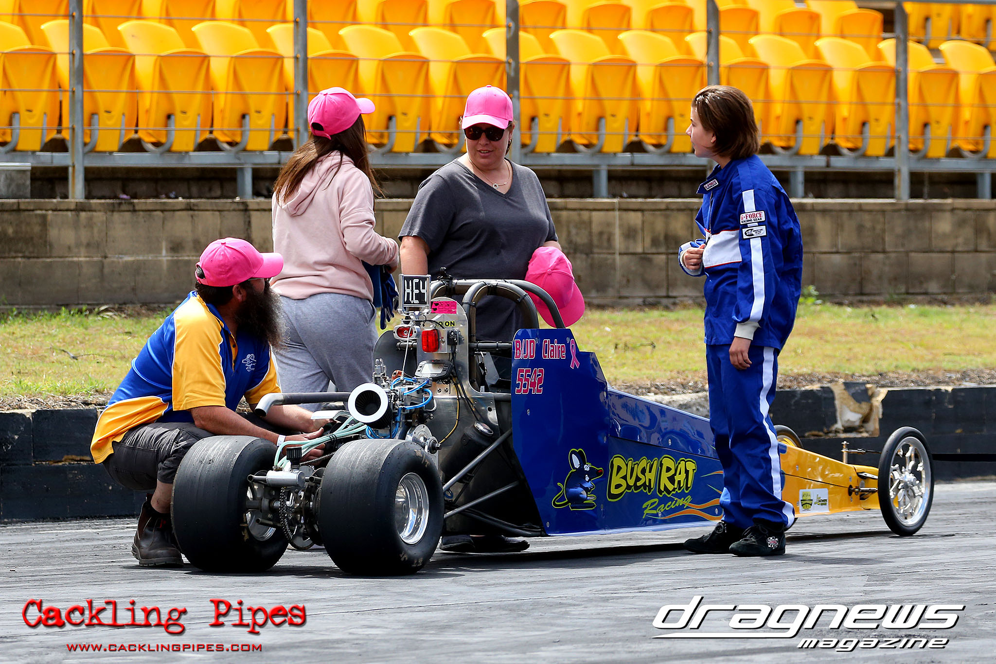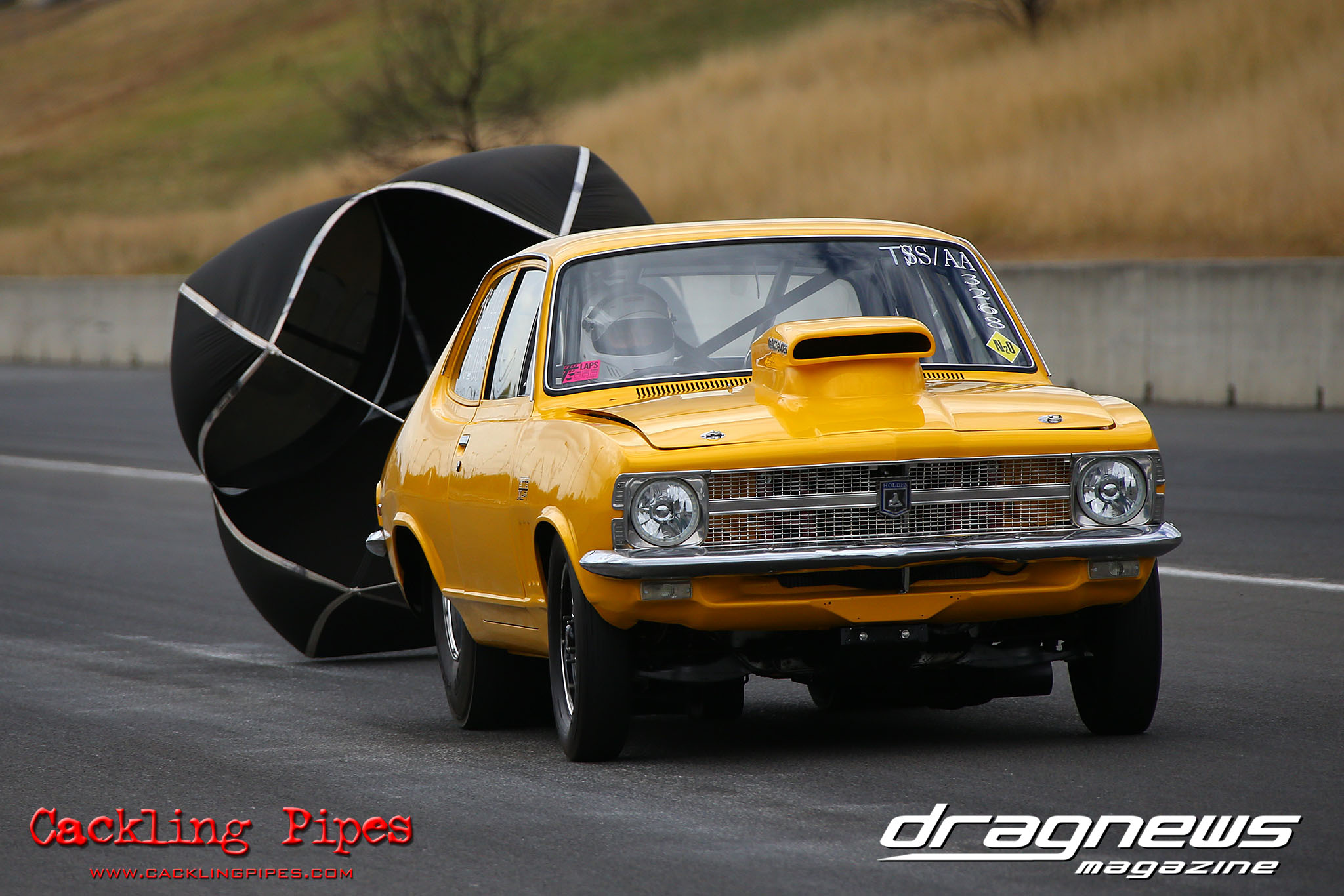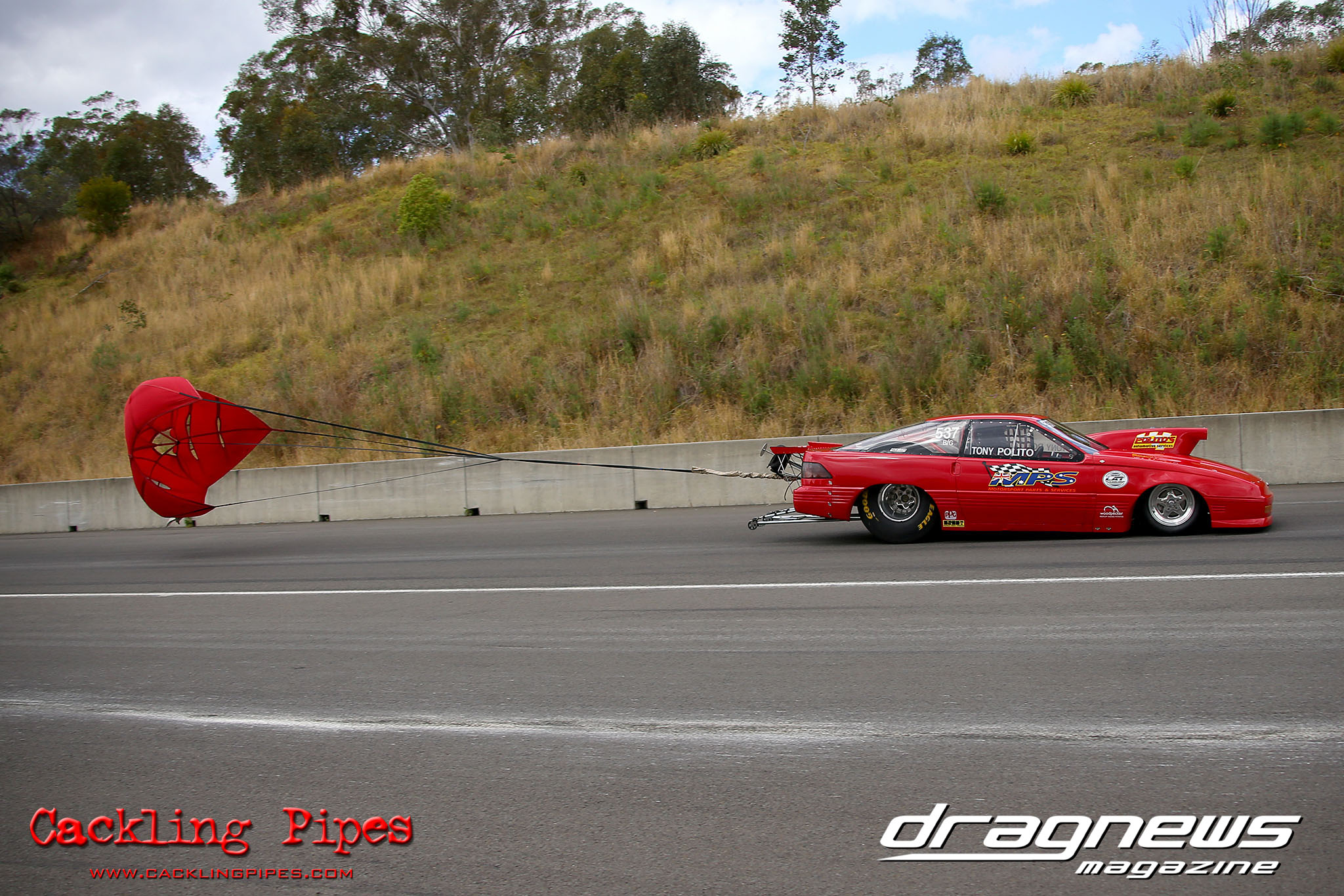 The day also featured a memorial run for the 10th anniversary for the passing of Canberra drag racing icon “Dangerous” Dougie Stewart. Doug’s twin daughters Allison and Kerrie continue the families drag racing legacy currently competing in Modified and Super Sedan respectively, and to honour their father, the OzTwins as they are known along with older sister Jacqui on the starter’s button, went side by side on a memorial run to release Doug’s ashes encased in the parachutes as they crossed the finish line.