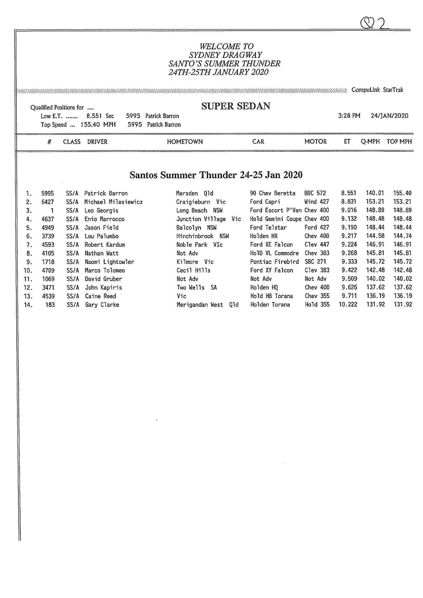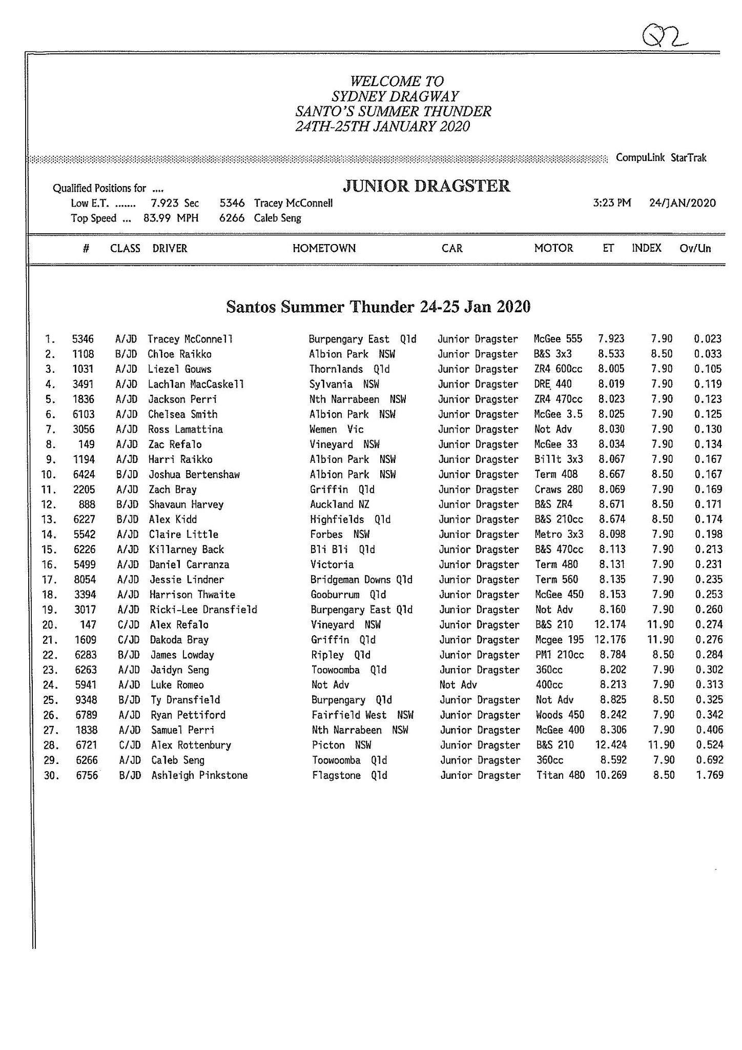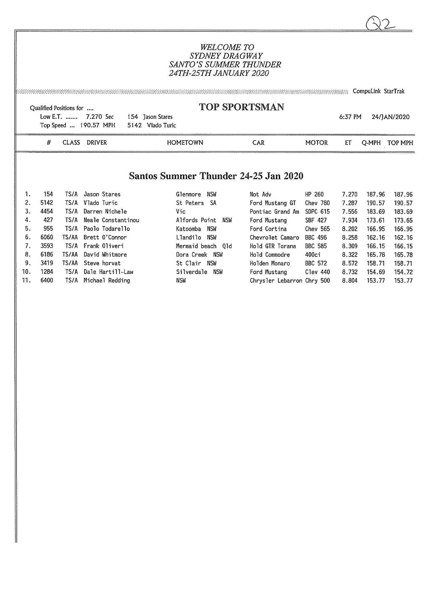 Early sportsman leaders include Daniel Camilleri (Super Comp), Ken Collin (Performance Bike), Jason Stares (Top Sportsman), Jess Turner (Modified), Patrick Barron (Super Sedan), Robert Simmonds (Modified Bike), Peter Hamilton (Super Street), Tracey McConnell (Junior Dragster) and Adrian McGrotty (Super Gas).