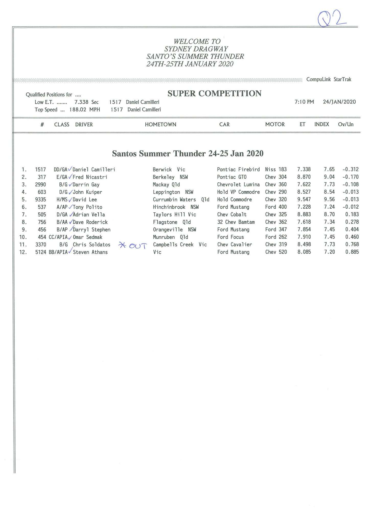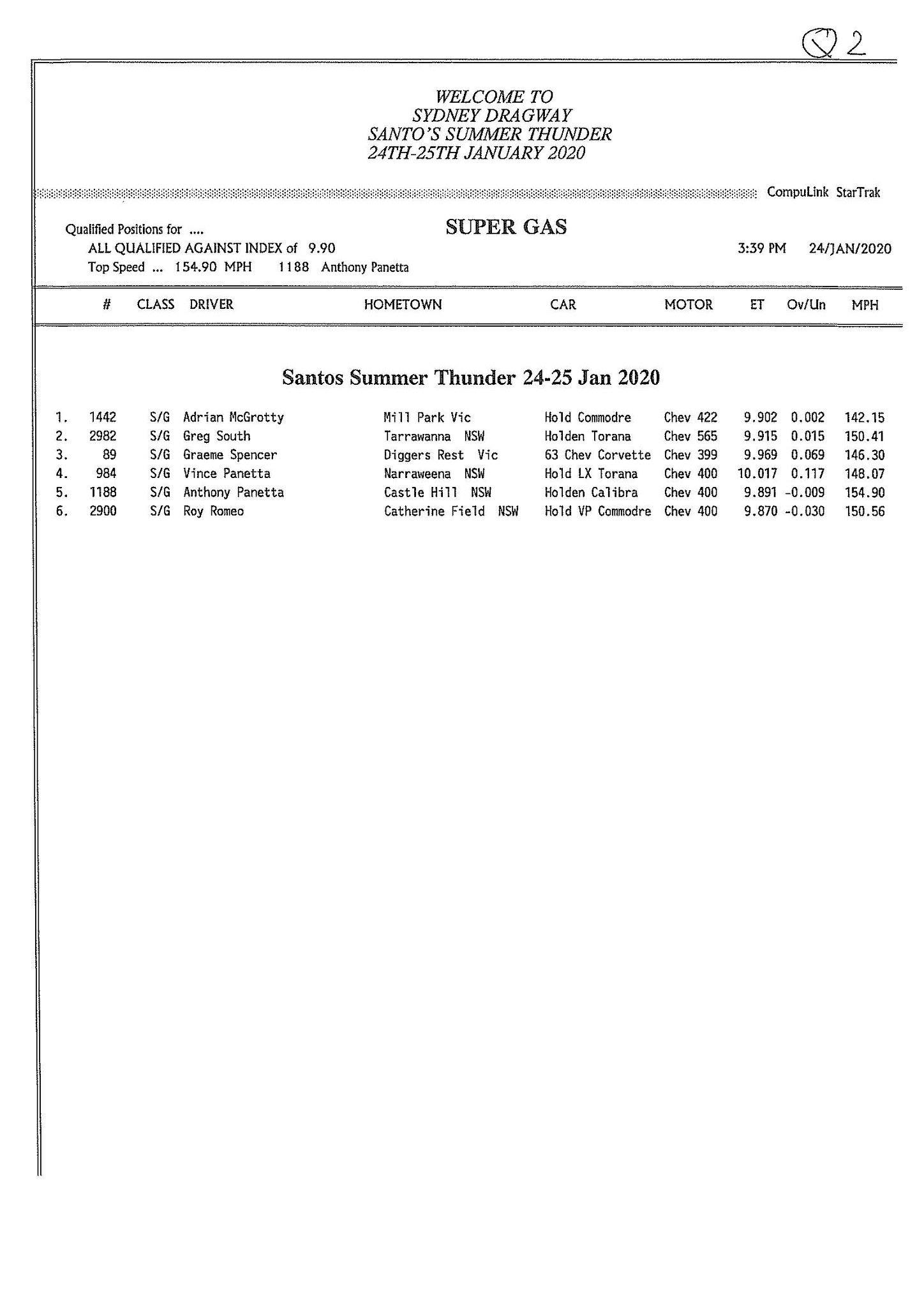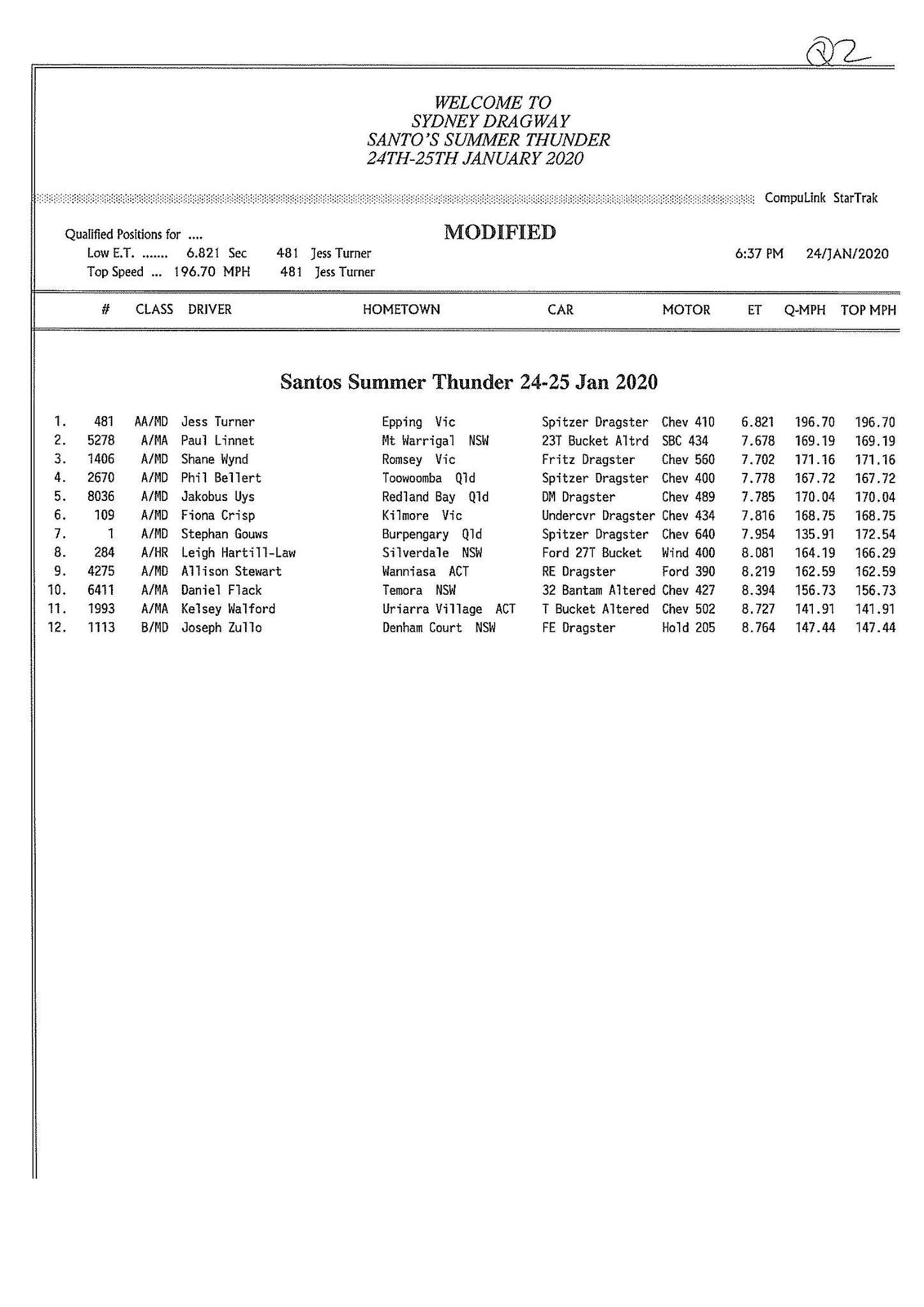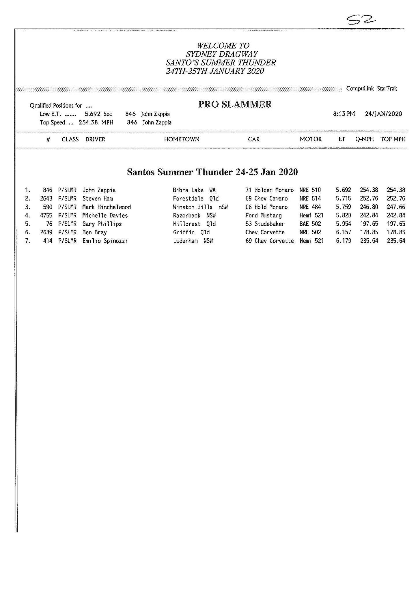 Pro Slammer looks like it will be a close affair come race day. John Zappia, coming into this event following an epic 5.58 run in Perth, was quickest with a 5.69, followed by Steven Ham on a 5.71 and Mark Hinchelwood with a 5.75. Michelle Davies was in strong form with a PB 5.82, following an earlier 5.86, showing some consistency pace. Gary Phillips had his Studebaker out for the first time in 18 months and was happy on a very early shut off 5.95.