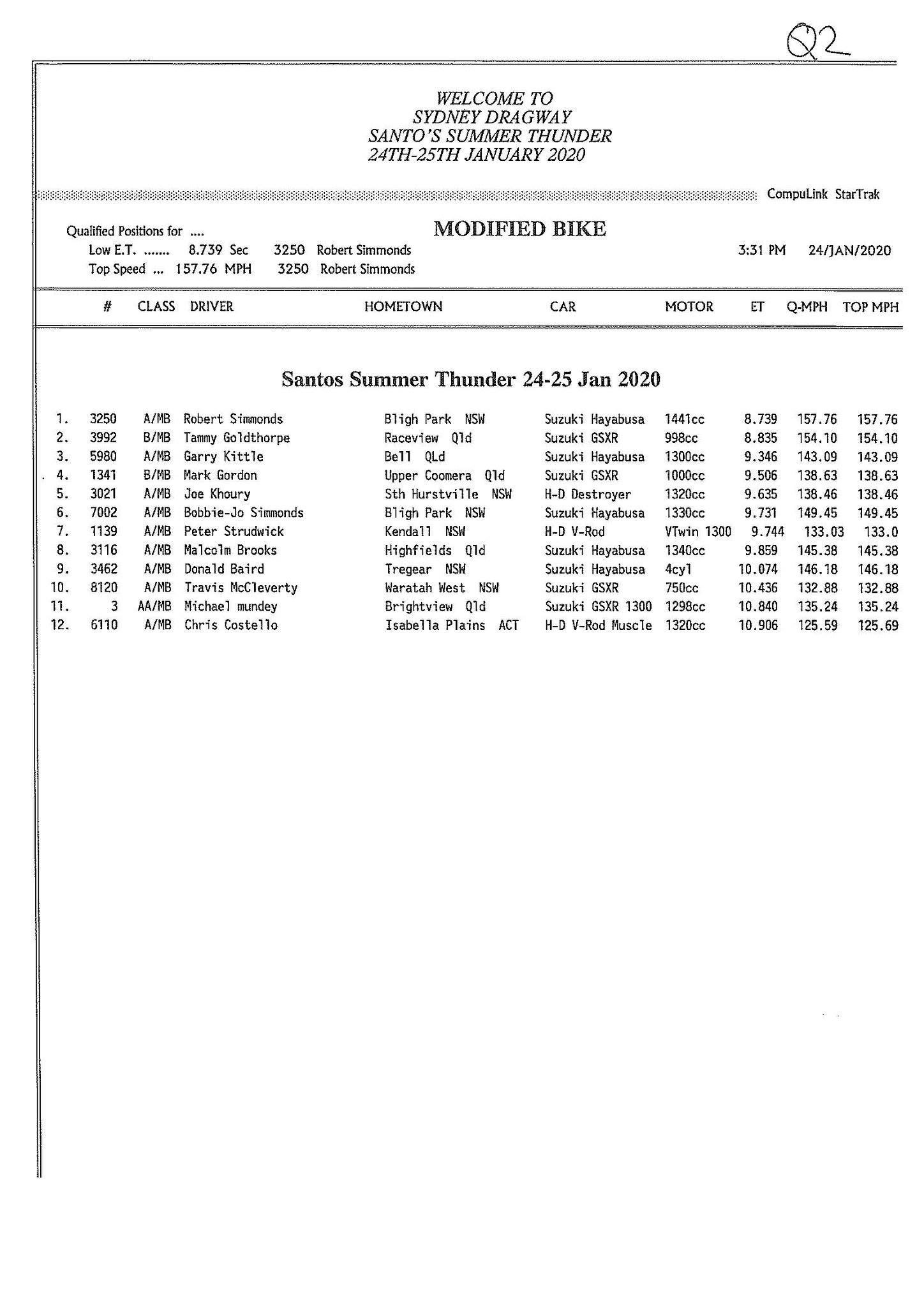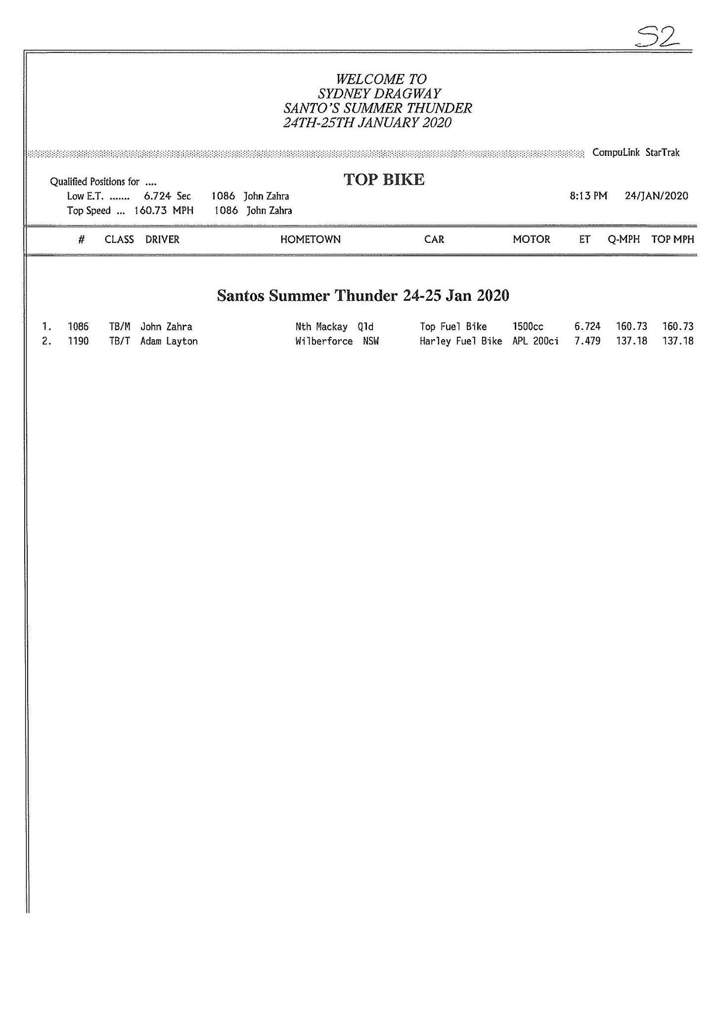 While Top Bike is unfortunately under exhibition status again with just two entries, there was some positive news with John Zahra completing licensing on his nitro four cylinder. Zahra dropped runs of 6.72 and 6.92 for the honours.