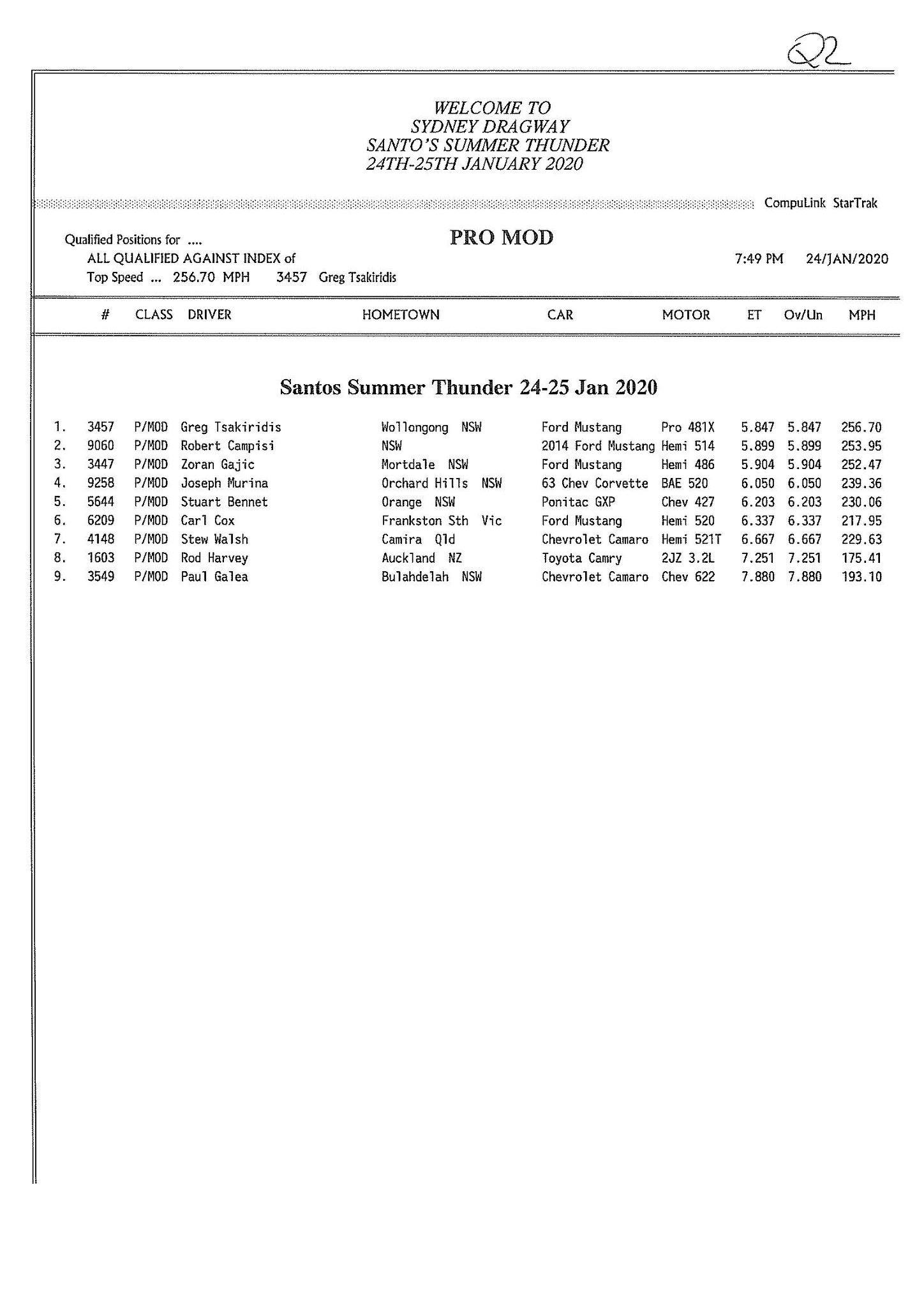 Pro Mod made its debut, using a ‘closest to 5.85’ format that brings together basically anything with swinging doors. Closest to the mark in the two qualifying sessions of Friday was Greg Tsakaridis with a 5.847, closely followed by a 5.899 by Rob Campisi and a 5.904 from Zoran Gajic. With an exciting range of combinations, the class looks set to provide some interesting racing come Saturday.
