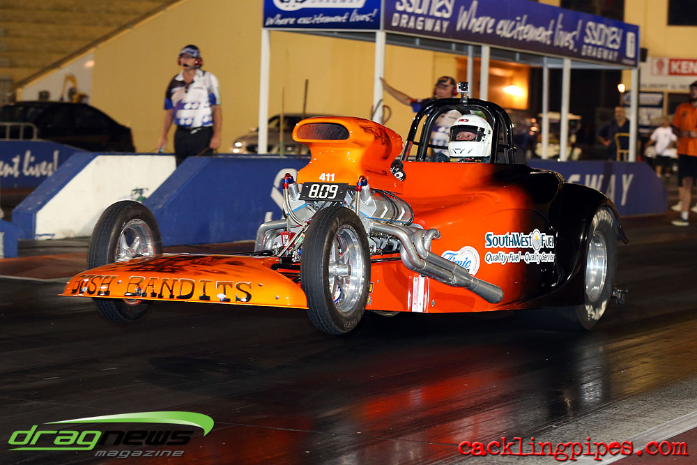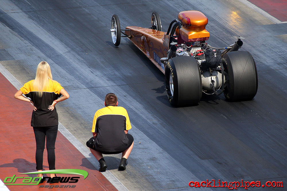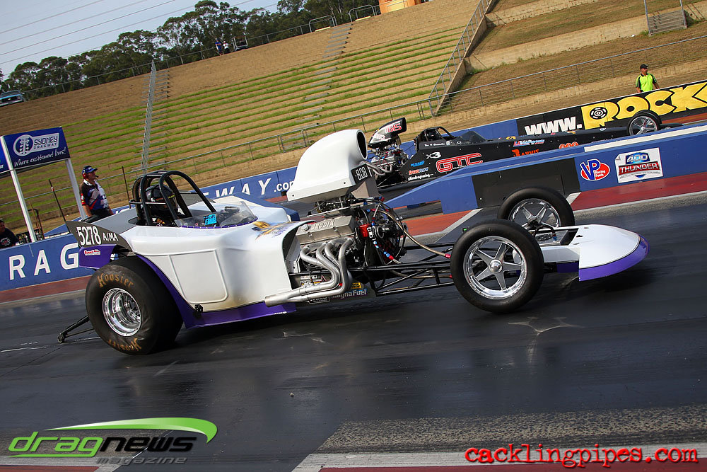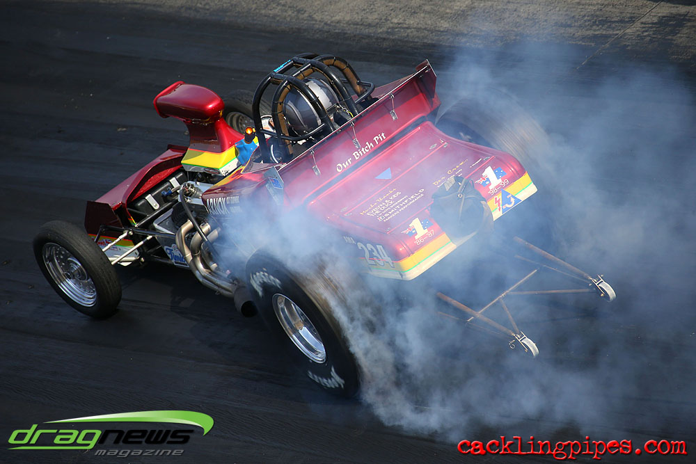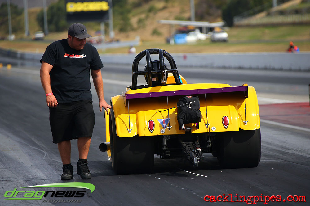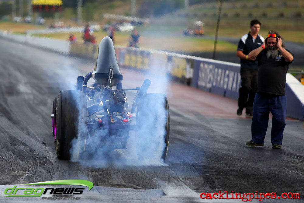 Peter Ilsey had a front end failure resulting his little altered cleaning up the wall in the braking area during Modified qualifying, Ilsey was unhurt but the altered was sans front wheel and fairly roughed up. Veteran racer Graham Millet was proving the rather be lucky than good theory during eliminations, Millet has not raced for some time and was running his newer altered – not the traditional “Bounty Hunter most link him with – however was fighting traction problems off the start line. The first round saw Millet put in a respectable 9.20 on a 9.10 to win on a big holeshot of Allison Evans, a red light from Stephanie Huysmans progressed him past round two where opponent Emma William broke out, and thanks to a solo in the semi Millet was in the final against the altered of Leon Flack. This where the fortunate circumstances ran out as the Millet machine spun the wheels on the line and Flack powered away with a safe 8.19 on a 8.11 to move into second in the track championship.
