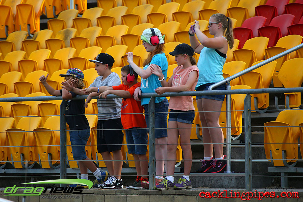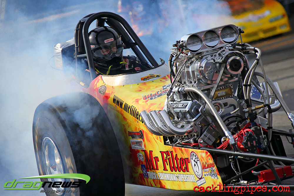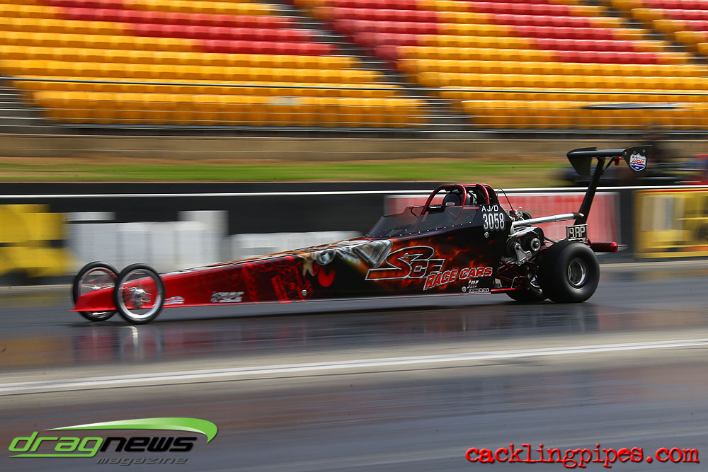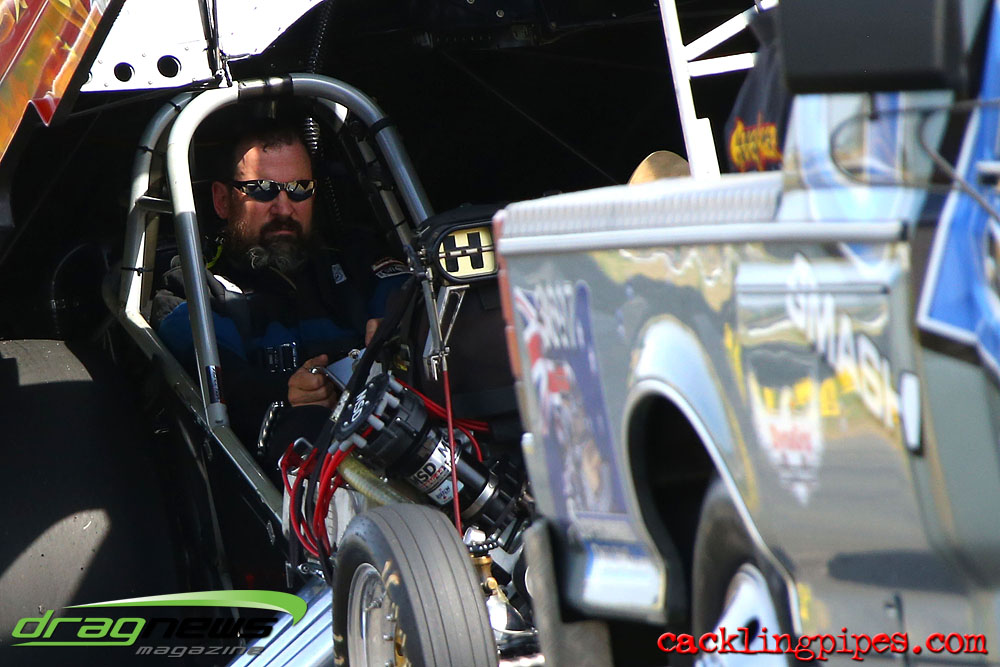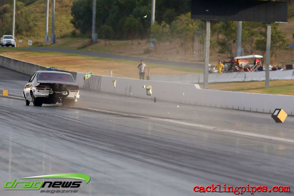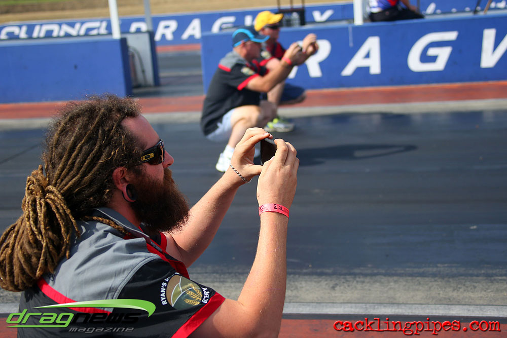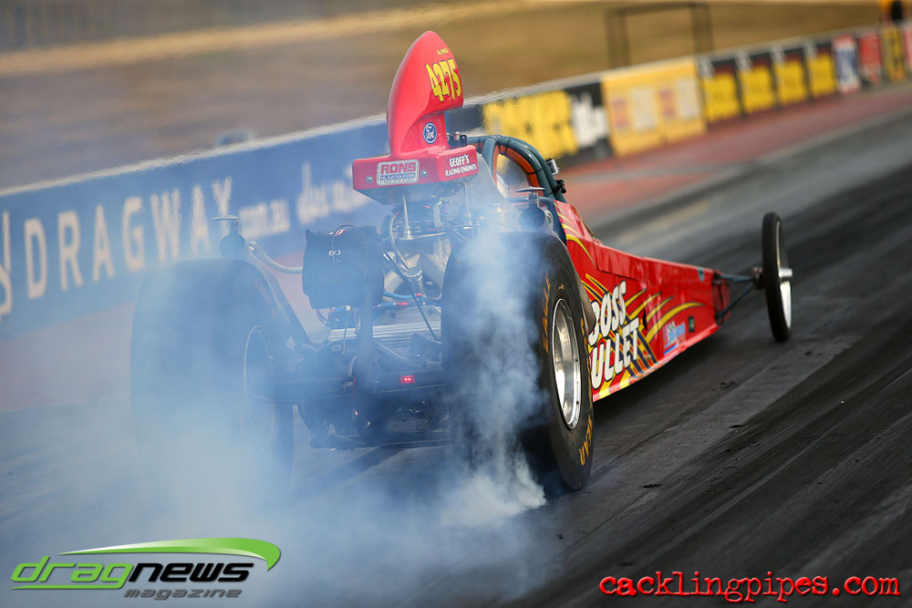Peter Ilsey had a front end failure resulting his little altered cleaning up the wall in the braking area during Modified qualifying, Ilsey was unhurt but the altered was sans front wheel and fairly roughed up. Veteran racer Graham Millet was proving the rather be lucky than good theory during eliminations, Millet has not raced for some time and was running his newer altered – not the traditional “Bounty Hunter most link him with – however was fighting traction problems off the start line. The first round saw Millet put in a respectable 9.20 on a 9.10 to win on a big holeshot of Allison Evans, a red light from Stephanie Huysmans progressed him past round two where opponent Emma William broke out, and thanks to a solo in the semi Millet was in the final against the altered of Leon Flack. This where the fortunate circumstances ran out as the Millet machine spun the wheels on the line and Flack powered away with a safe 8.19 on a 8.11 to move into second in the track championship.