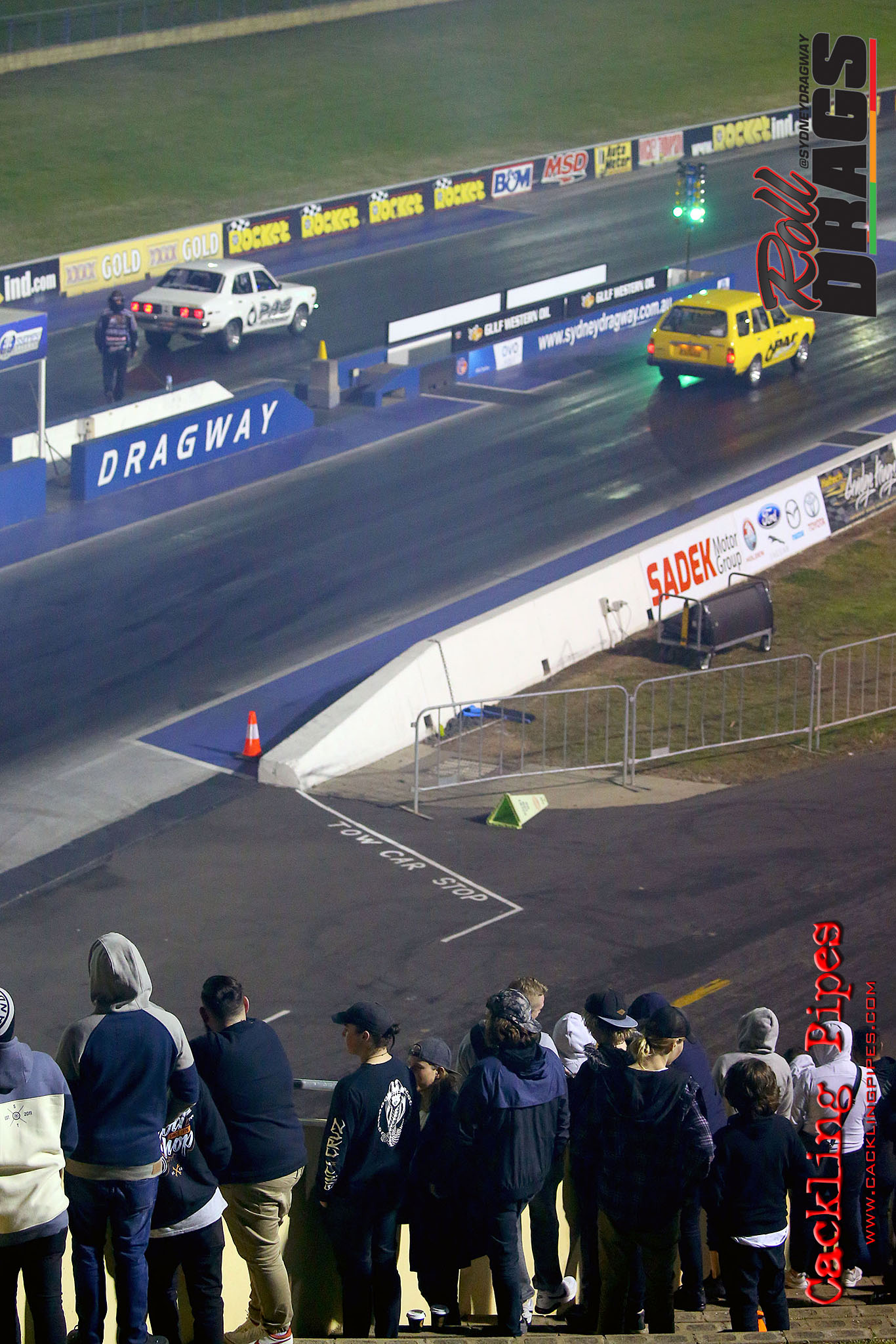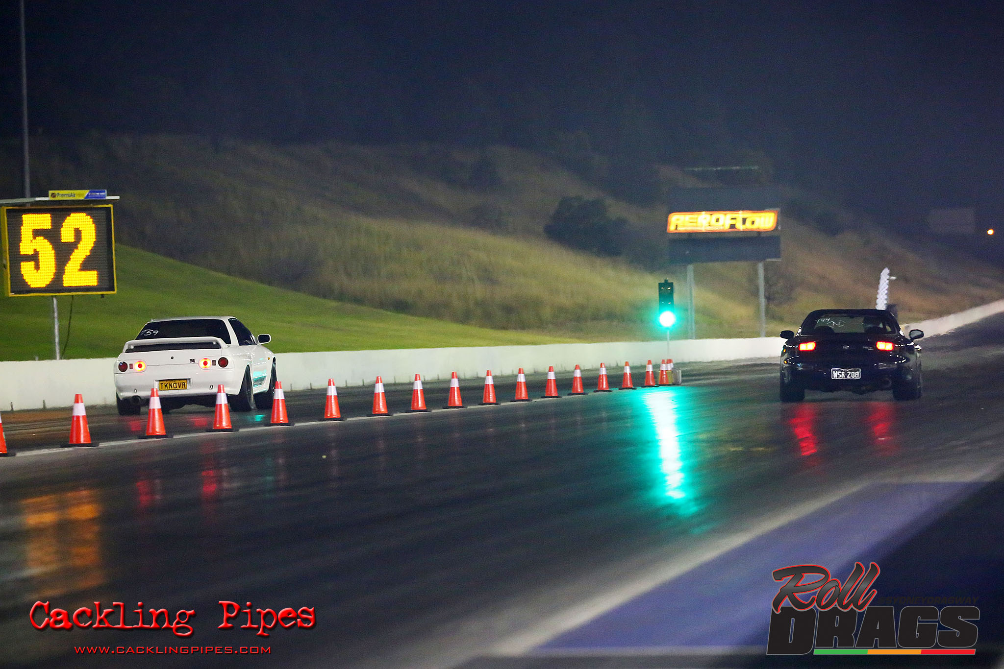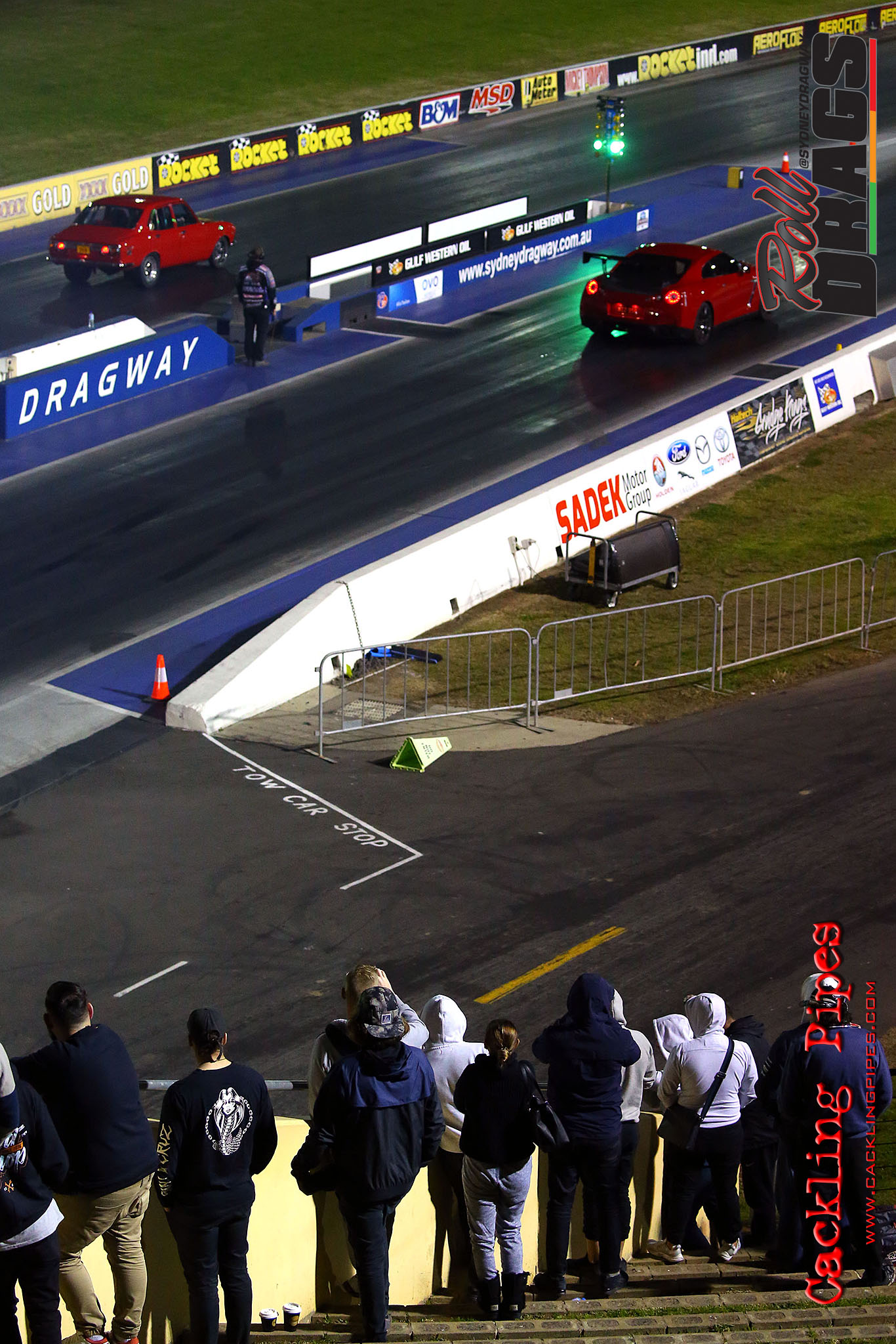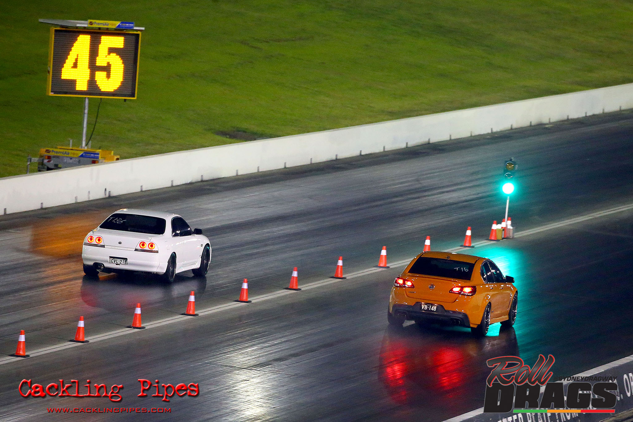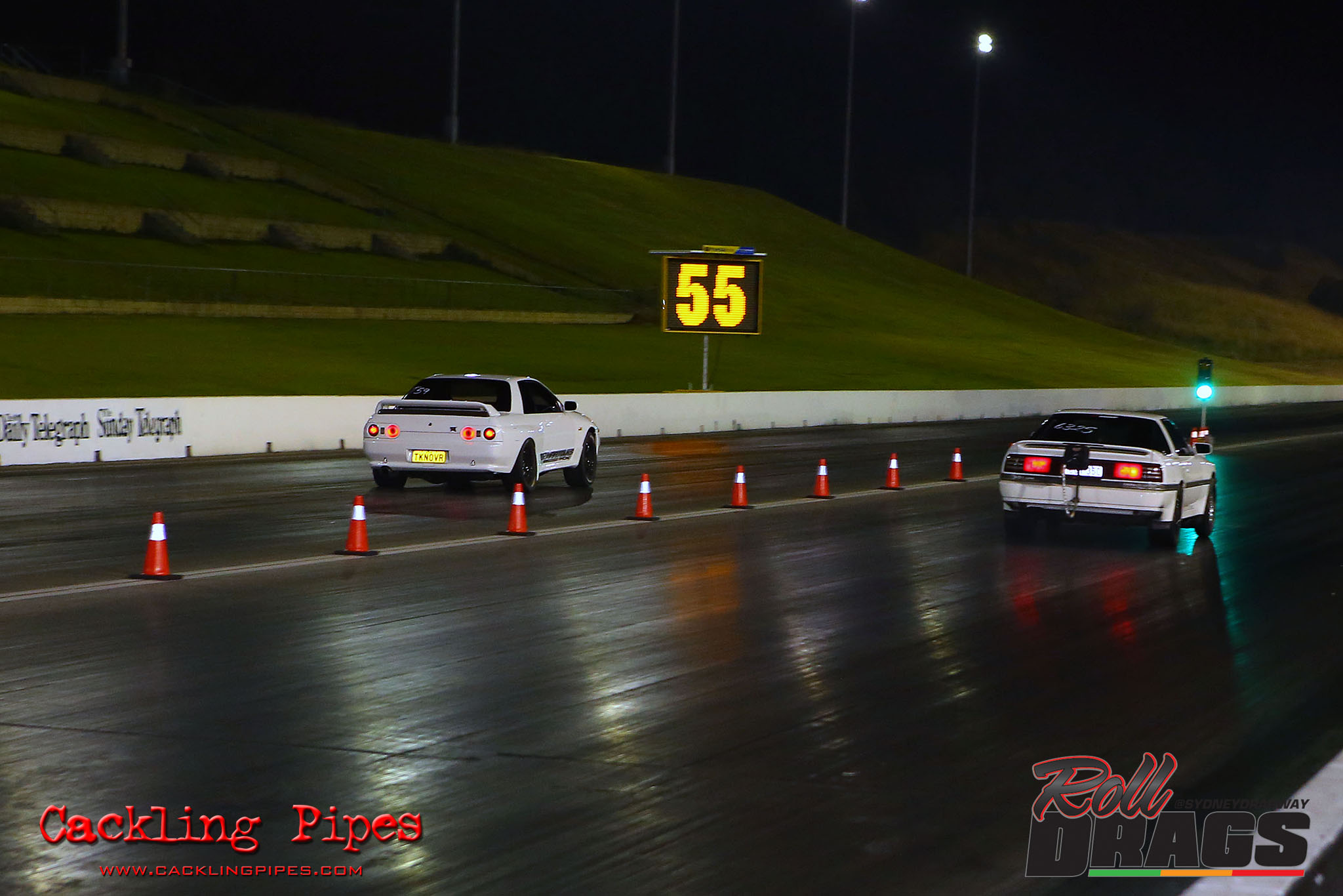 The concept is simple, racers perform their normal burnout and stage routine to set the track timers so a winner can be determined. Both cars then keep pace at 50kph rolling up to a second Christmas tree, drivers dropping the hammer on that tree going green – first to the end wins.