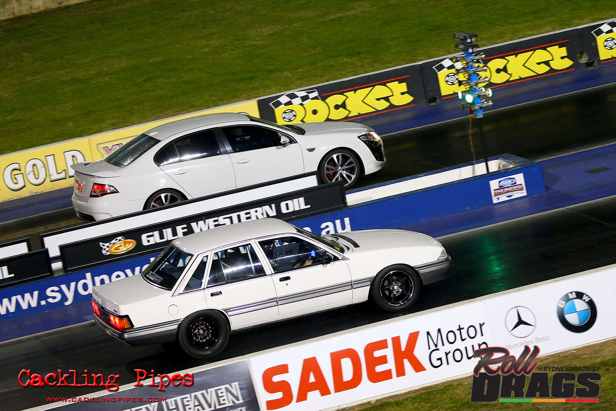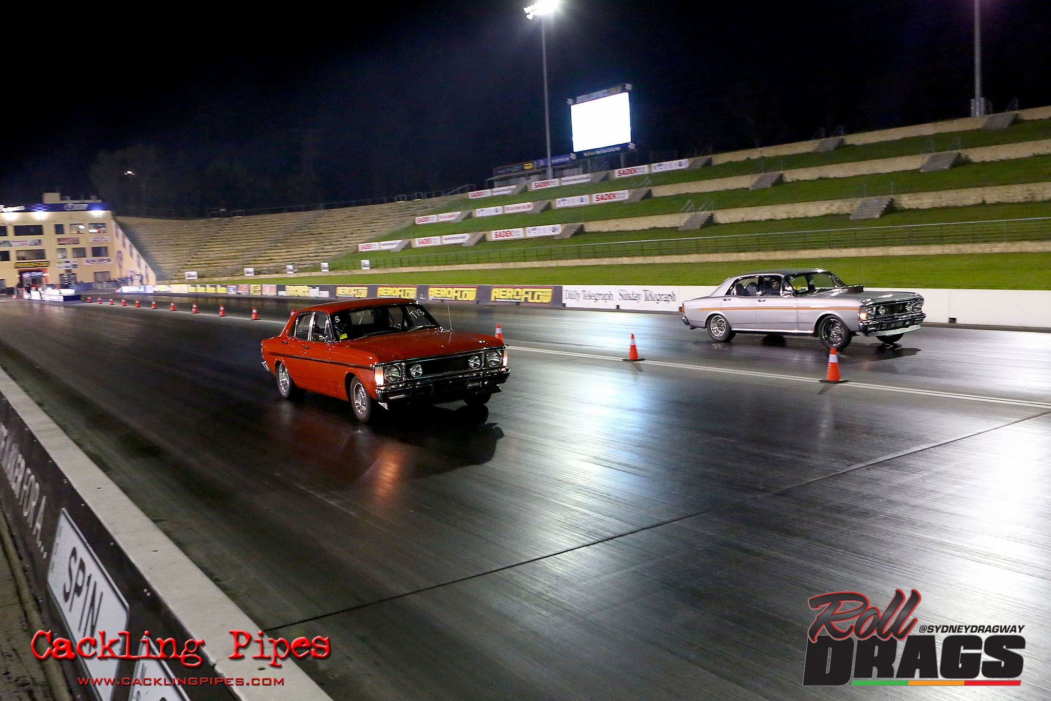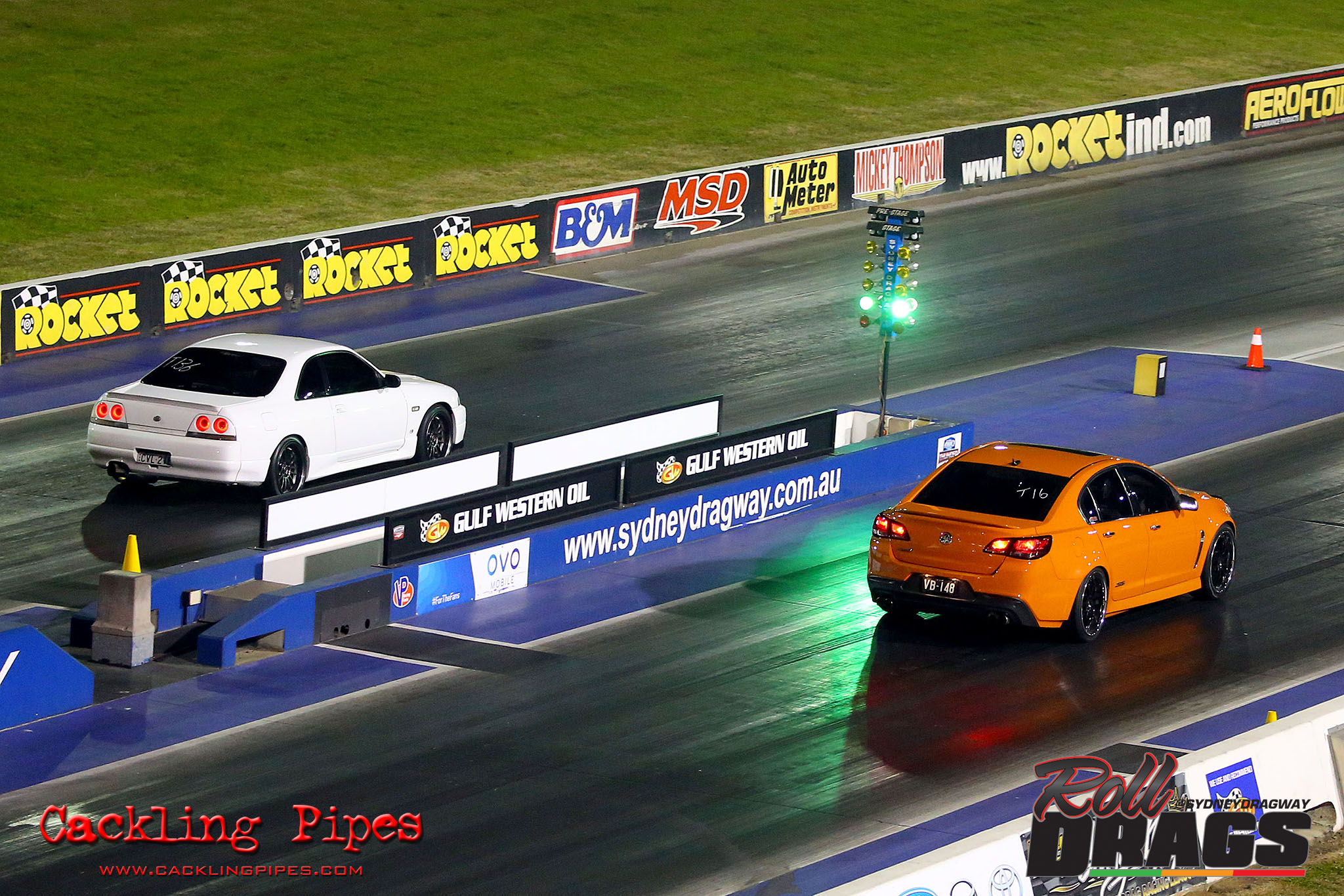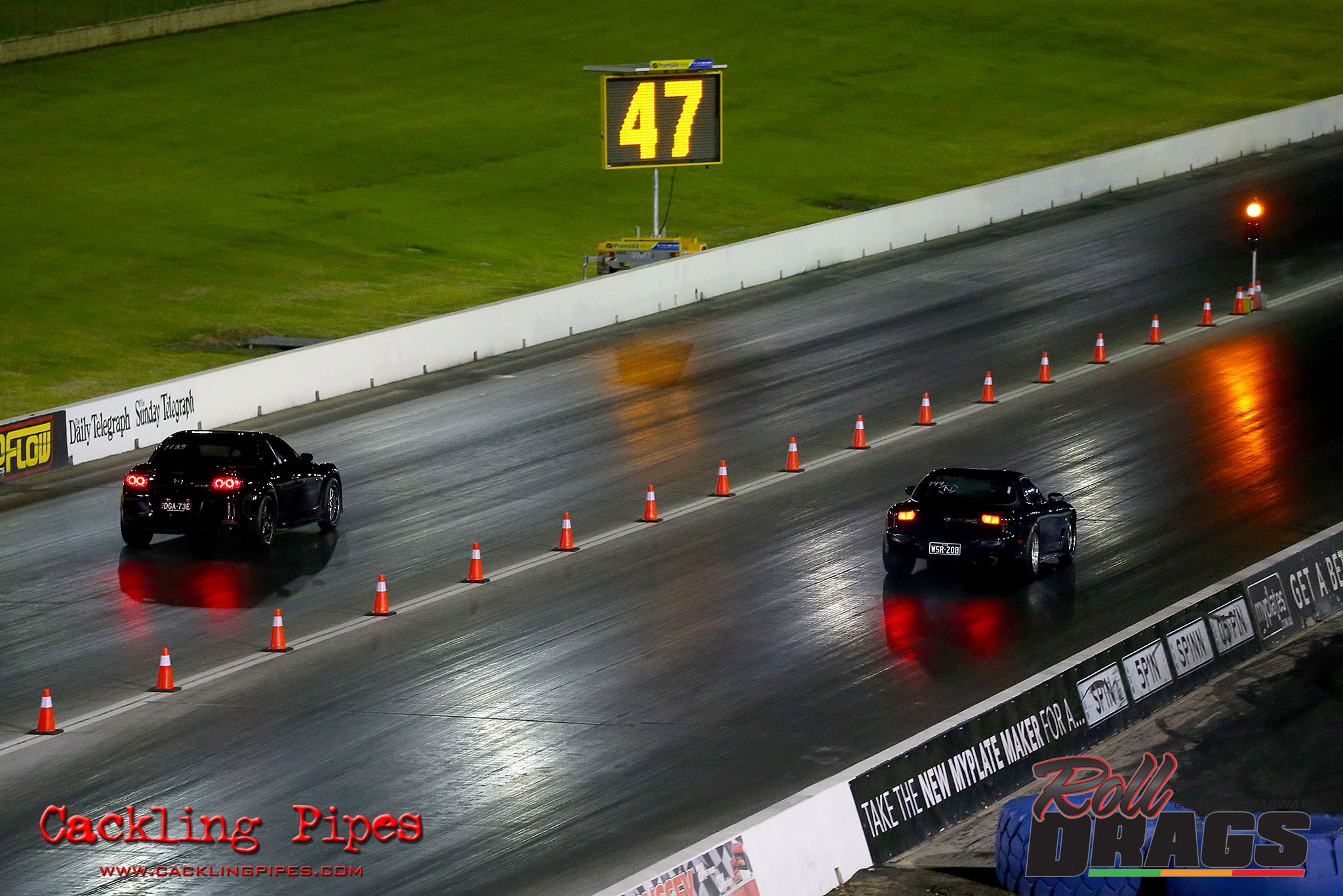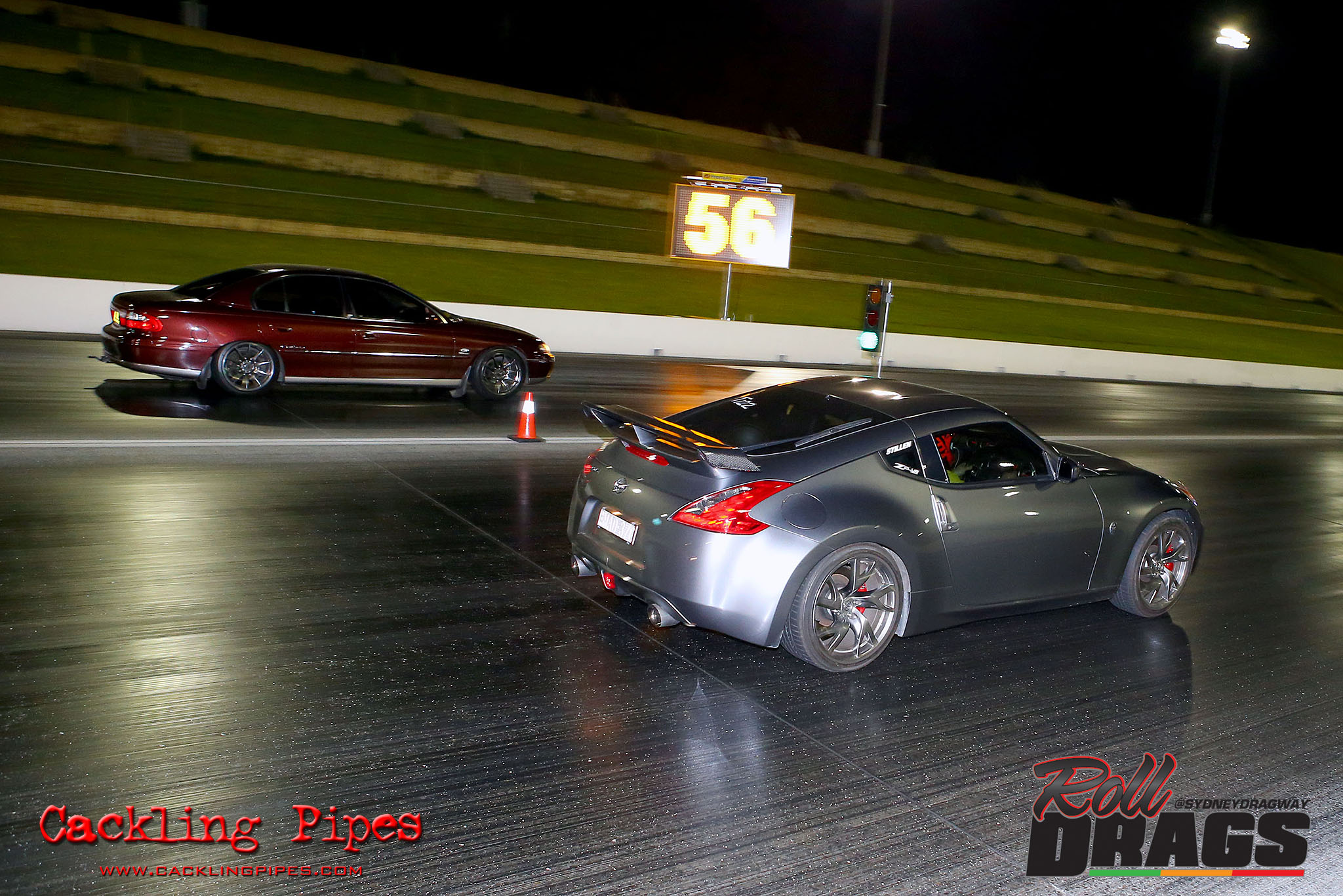 The concept is simple, racers perform their normal burnout and stage routine to set the track timers so a winner can be determined. Both cars then keep pace at 50kph rolling up to a second Christmas tree, drivers dropping the hammer on that tree going green – first to the end wins.