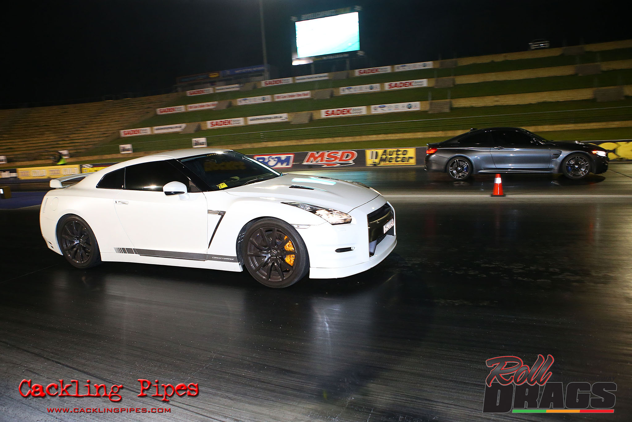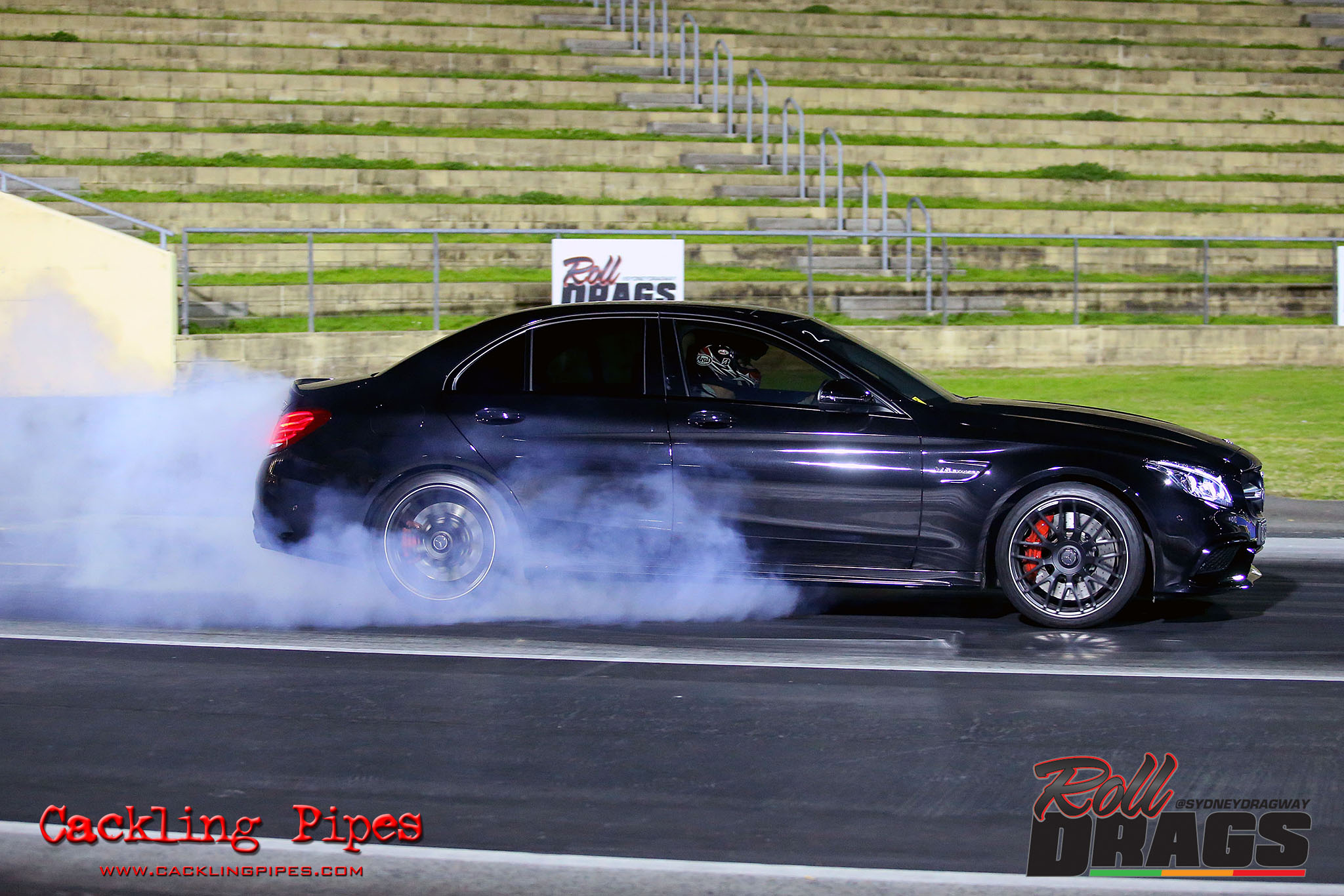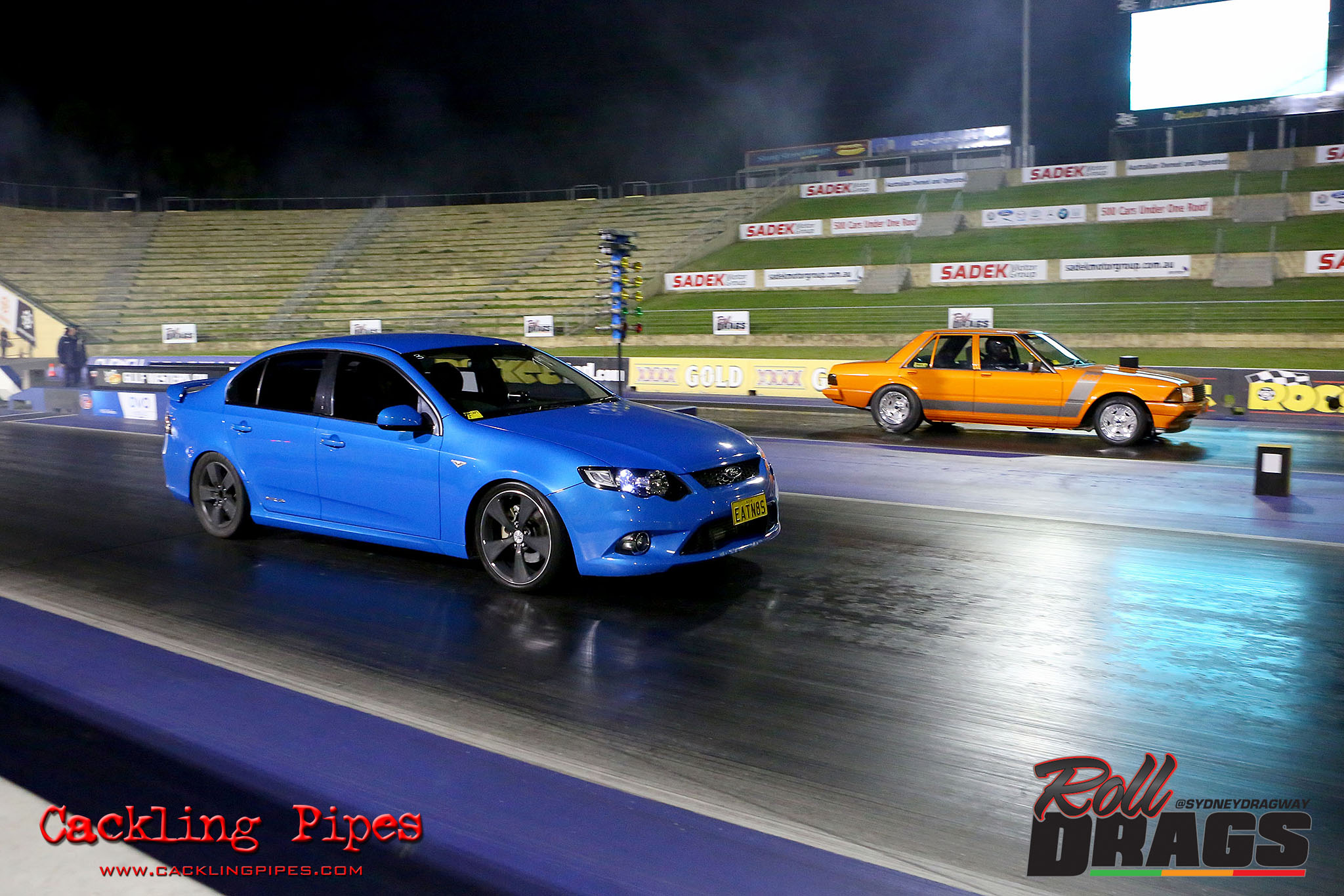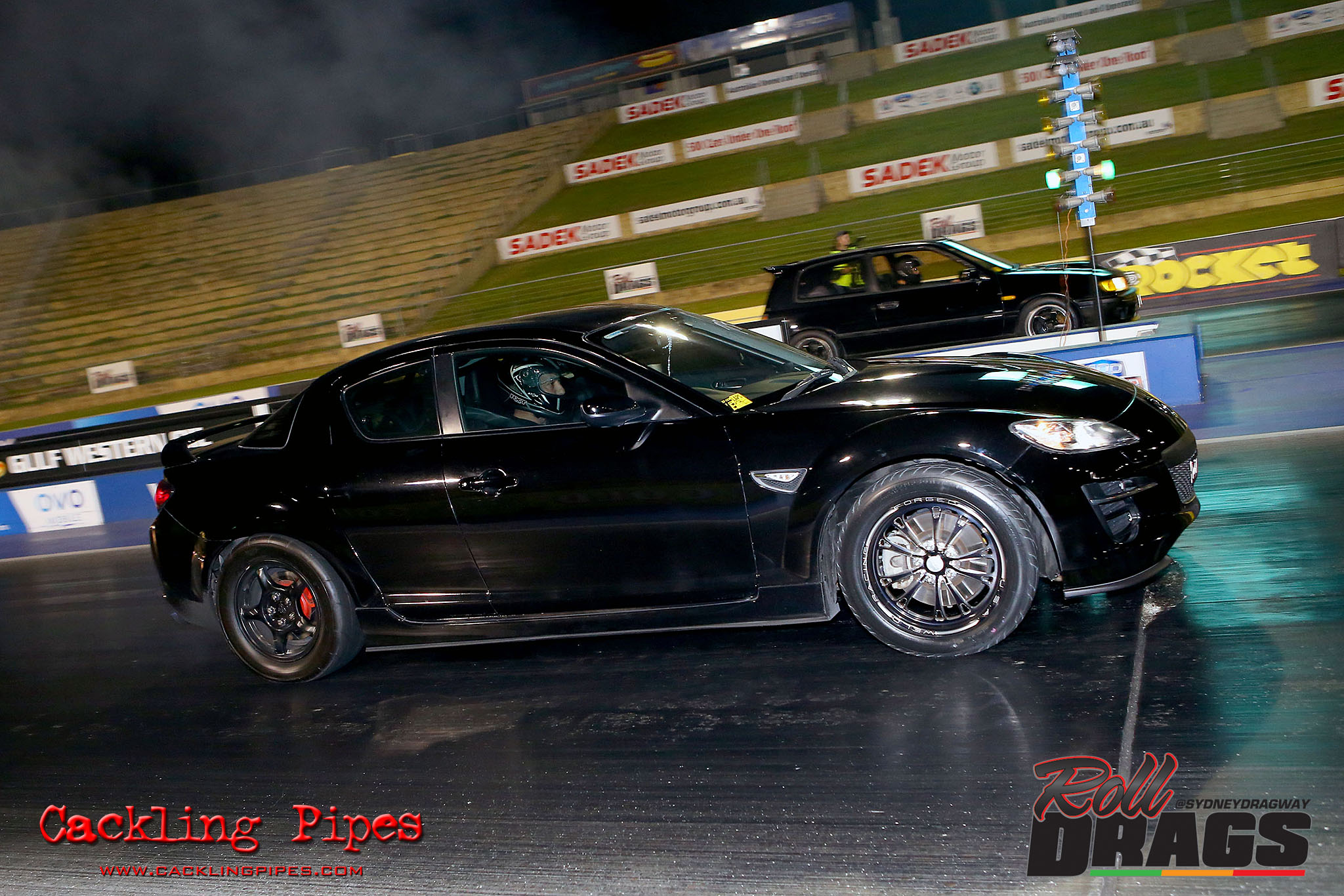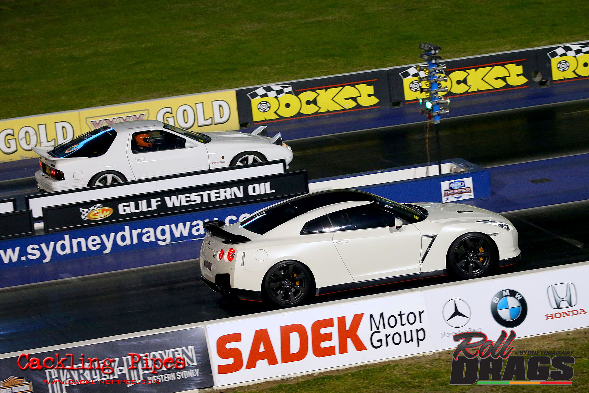The concept is simple, racers perform their normal burnout and stage routine to set the track timers so a winner can be determined. Both cars then keep pace at 50kph rolling up to a second Christmas tree, drivers dropping the hammer on that tree going green – first to the end wins.