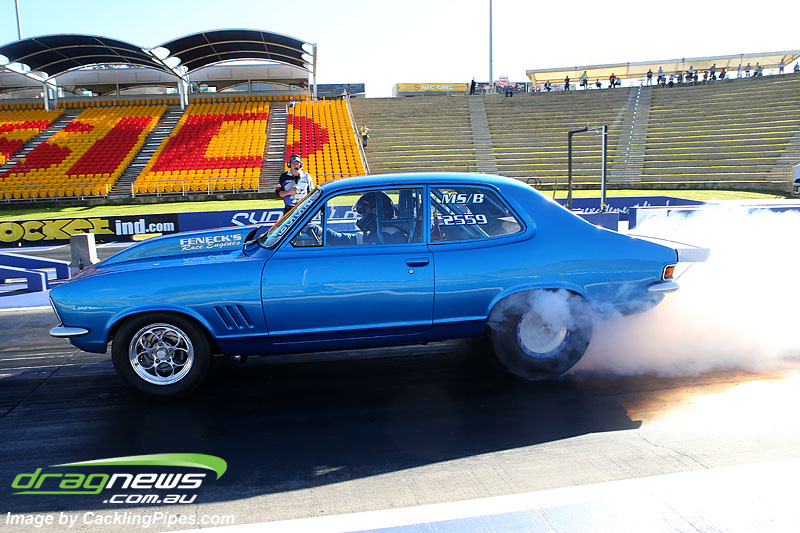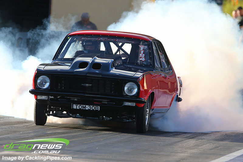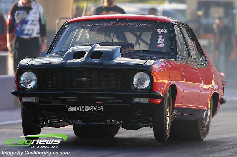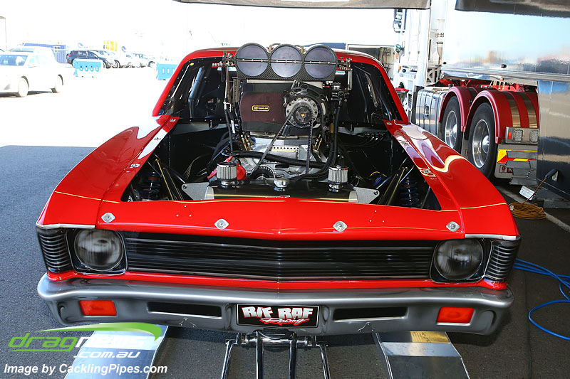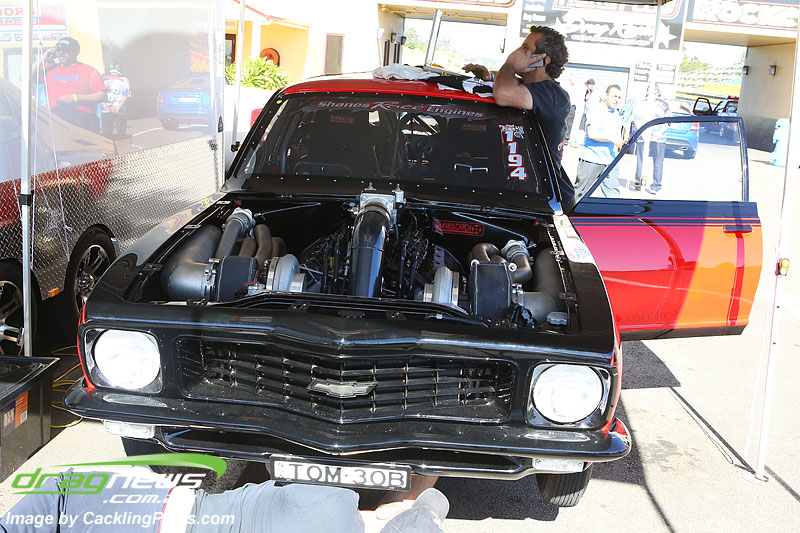 Adam Buffett has been sitting idle with his Torana for a while now, a transbrake problem left a soft foot brake launch on his only pass of the day, nitrous will be turned on tomorrow.