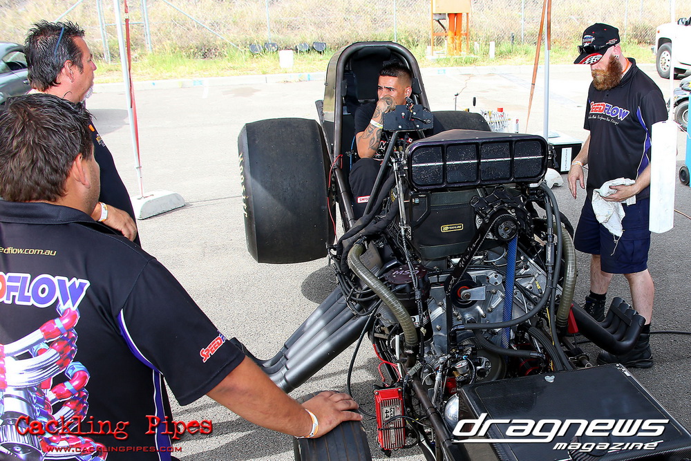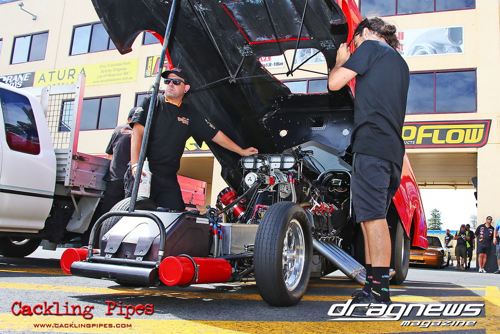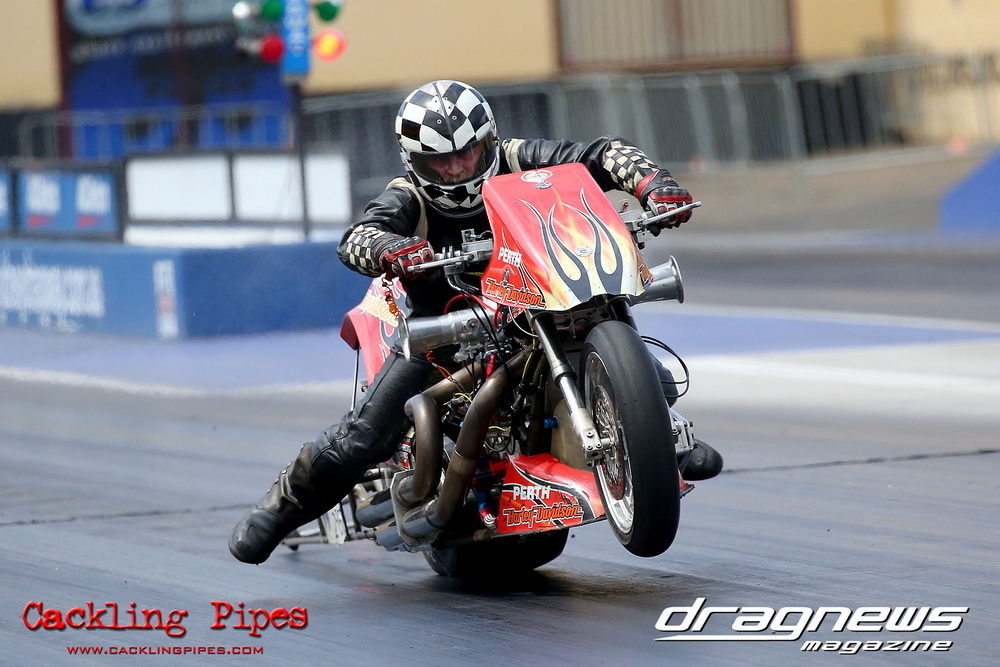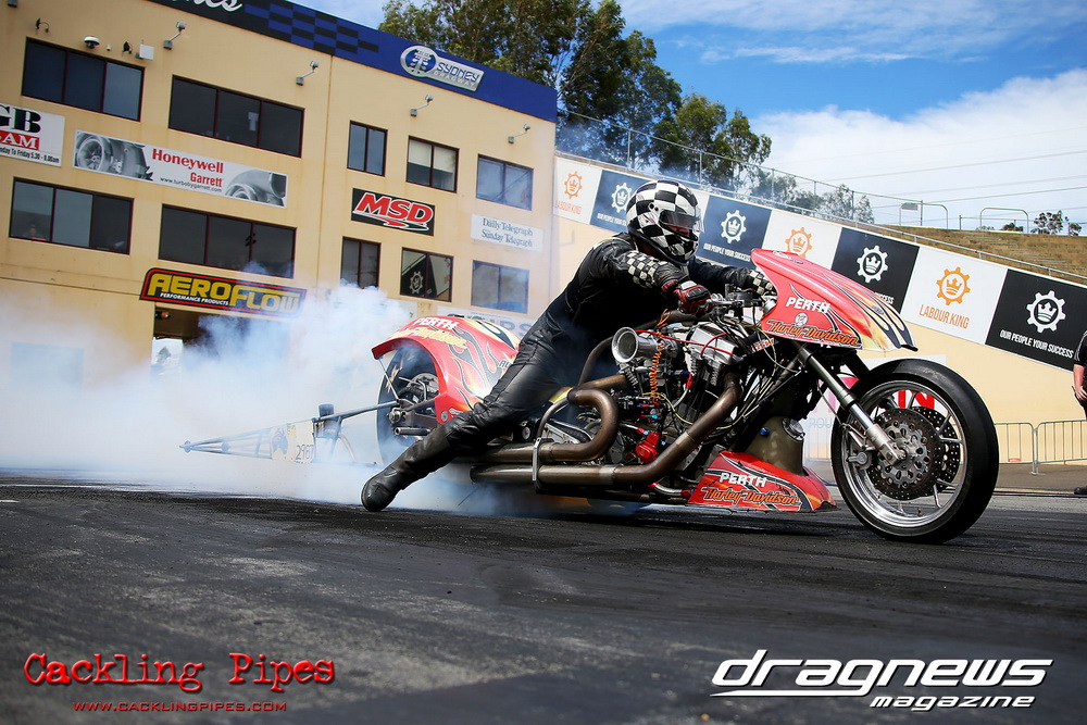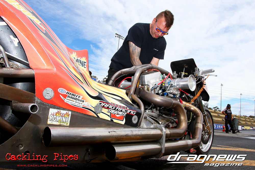 Mark Drew was in town early with the colourful Fin Jaska Salakari to test the new fuel system on the Australia’s quickest nitro Harley.